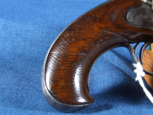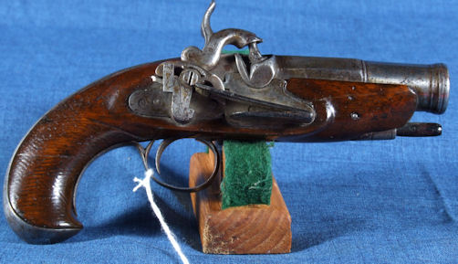 Early Spanish Migulet Pistol, engraved and worn overall, with wear to metal and checkered grip. Functional, some oil has been added to the wood at some modern time. Very good overall. Some repaired stress lines, glued, with only line visible. Well done repairs.