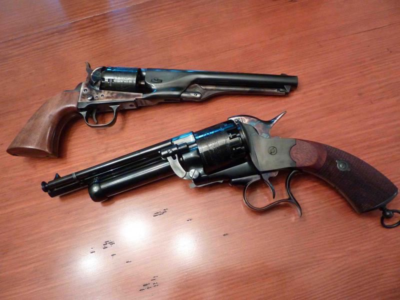 Colt 1861 de Uberti (a las cachas les he eliminado el acabado brillante y rojizo - muy sensible arañazos - y dejado el color del nogal a la vista con cuatro manos de aceitado). No sé si esto es históricamente más correcto, pero en mi opinión, quedan mucho mejor que con el acabado de fábrica).