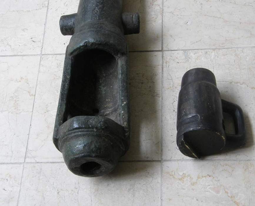 En esta pieza de retrocarga, se ve muy bien el sistema. Esa especie de jarra, es la recámara, para la pólvora que se sujeta al cañón con el asa hacia arriba, al girarla, se introduce un tetón en la acanaladura del inferior de la recámara, lo que sujeta esta a la pieza.