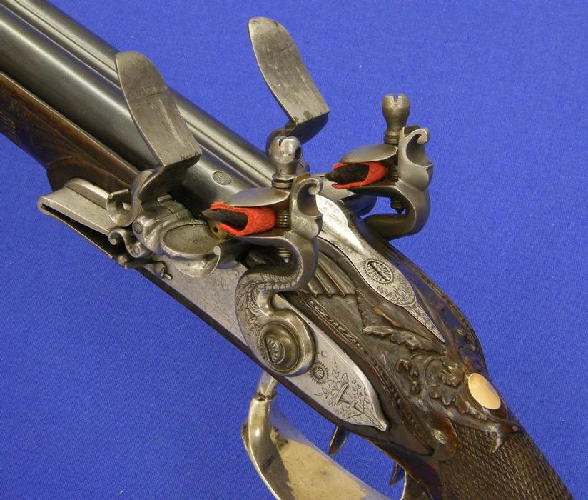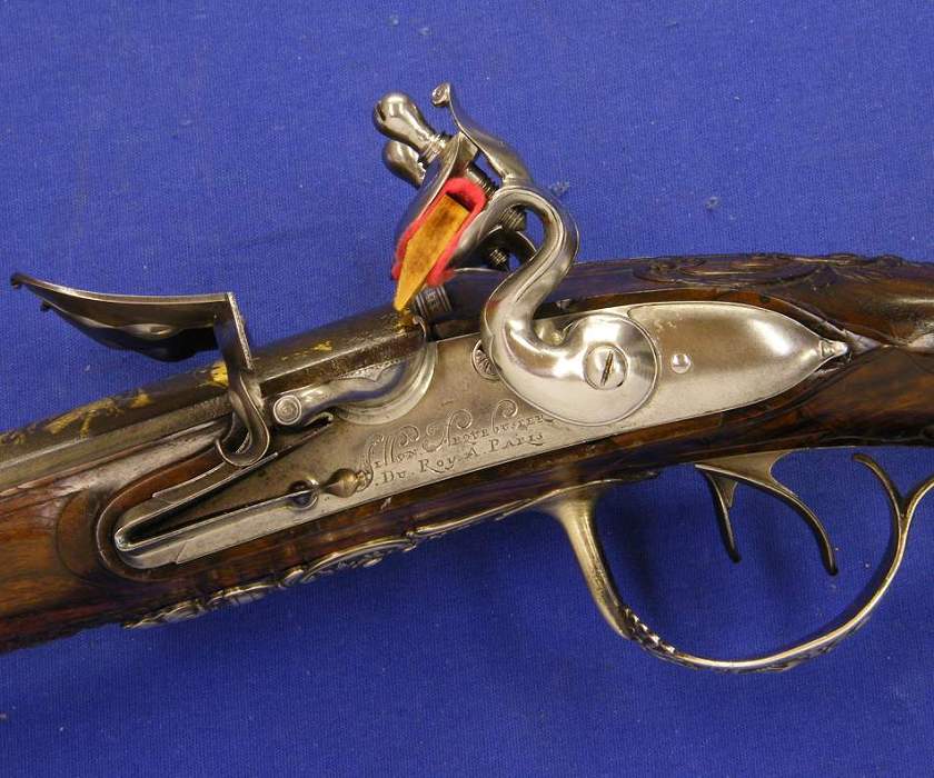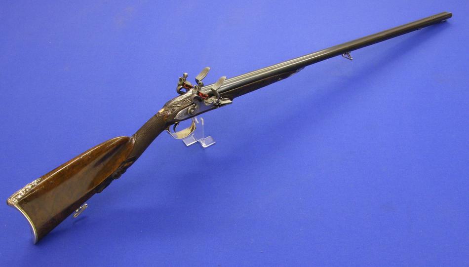 Puees bueno ... un arma francesa de doble cañon y doble llave de silex por Hubert Le Clerc de Paris hacia 1.770 con los aparejos montados en fina plata labrada. Calibre de 14 mm. y un largo de 125 cm. Como es norma de esta casa, en muy buenas condiciones.