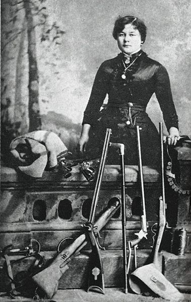 MRS. JESSE (ZEE) JAMES) An alleged photograph of Jesse James’ wife pictures a young lady standing behind a display of rifles and handguns, and it was supposedly taken when Zee James acted in a stage performance, following her husband’s death.