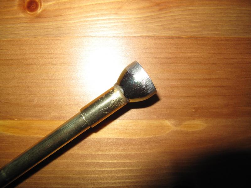 Se corta un trozo de tubo, ahora del de mayor sección, de unos 2 cm. de largo y se introduce por el tubo estrecho, llevándolo hasta la parte superior, donde la unión con el embudo. Se pega justo ahí, tambien con araldit, con lo que la unión queda mas segura y mejor rematada.