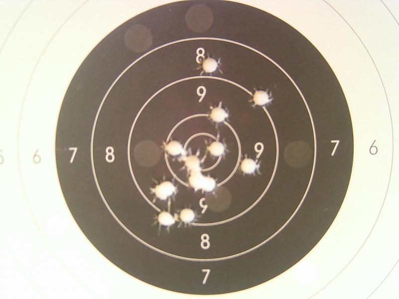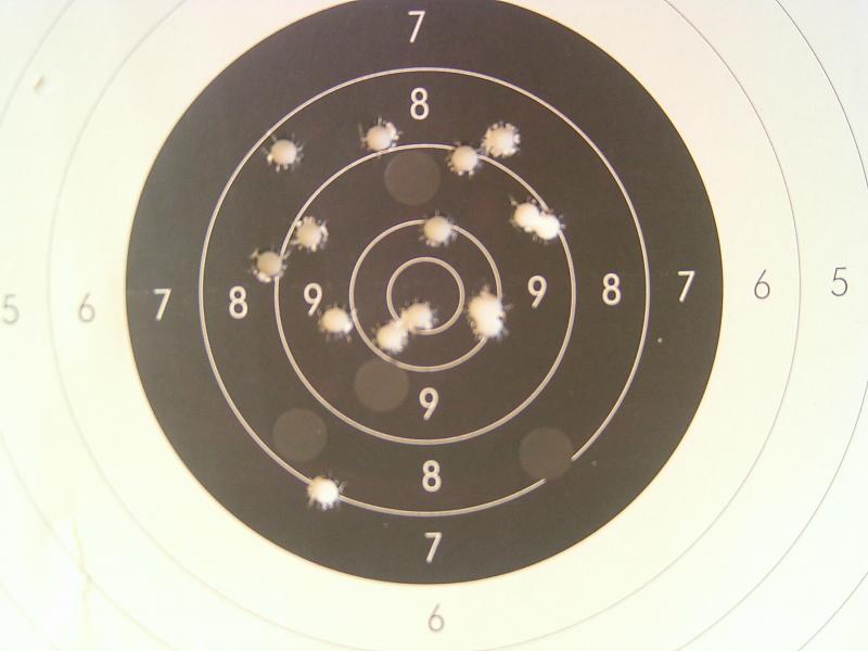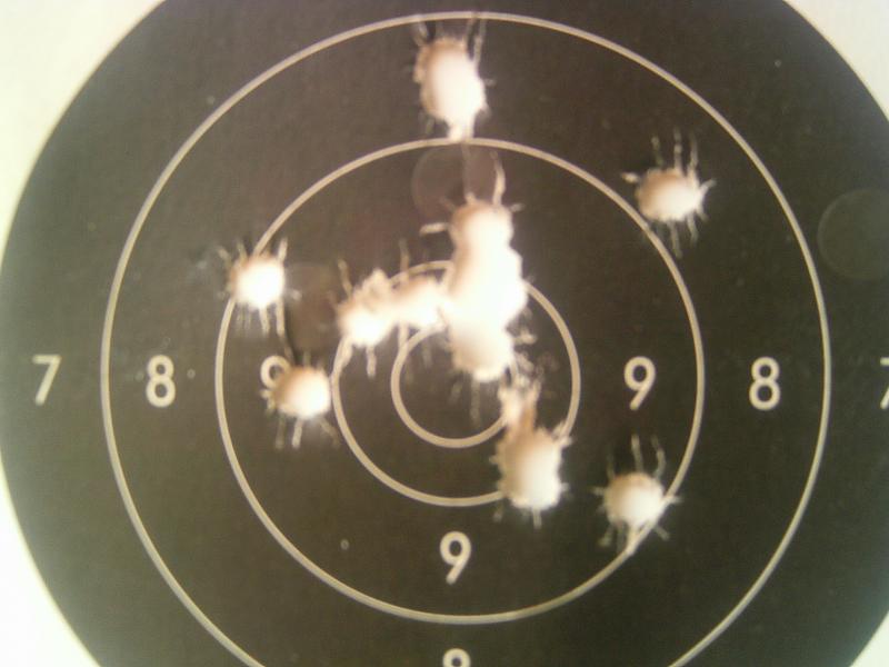 He vuelto a la carga de 60 grains de S3 y sin sémola y los tiros vagan por el ocho - nueve alto sin que se vean cacahuetes, me decido a poner sémola y la cosa mejora (al menos son dieces que eso siempre da gustirrinin) pero salvo un trébol a las cuatro la paella me sigue saliendo "sueltecita" :( con un tiro bajo totalmente fuera de la agrupación. :cry:
