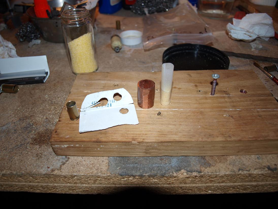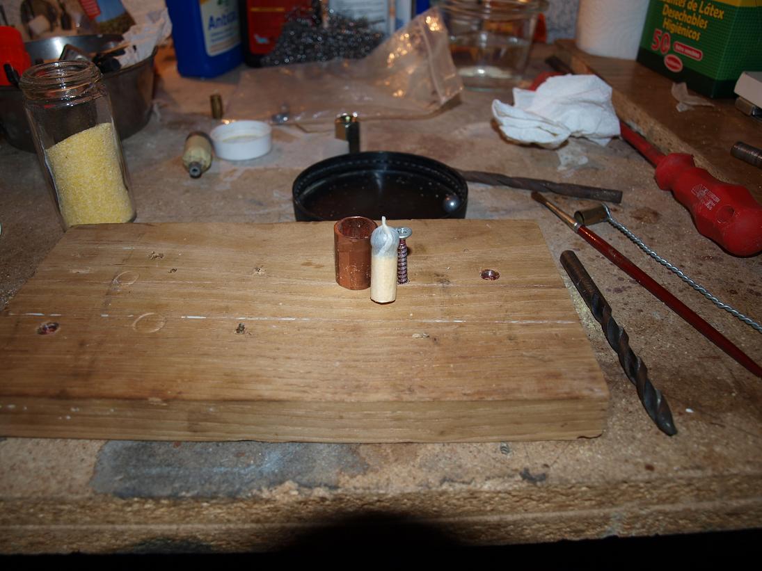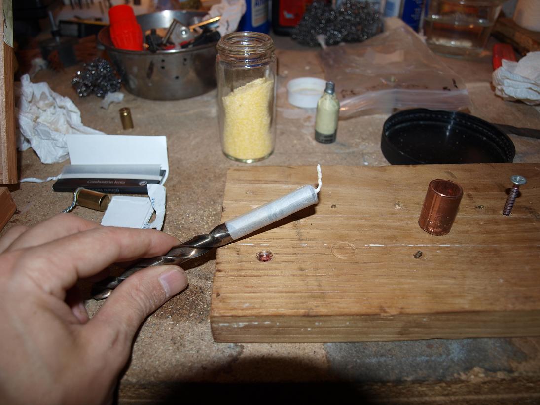 Ponemos el papel en un trozo de tubo de cobre con la medida de altura cortada a 1.1 y rellenamos con la medida de sémola. Ponemos un disco de cartón sacado de una caja de munición con un cartucho del 9 afilado a modo de sacabocados. Apretamos el conjunto con una broca un poco mas fina.
