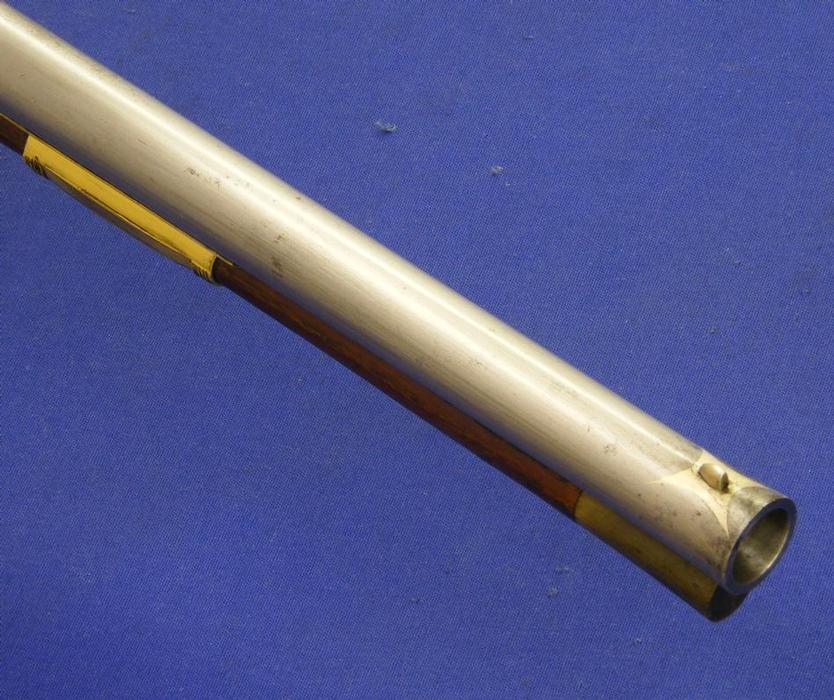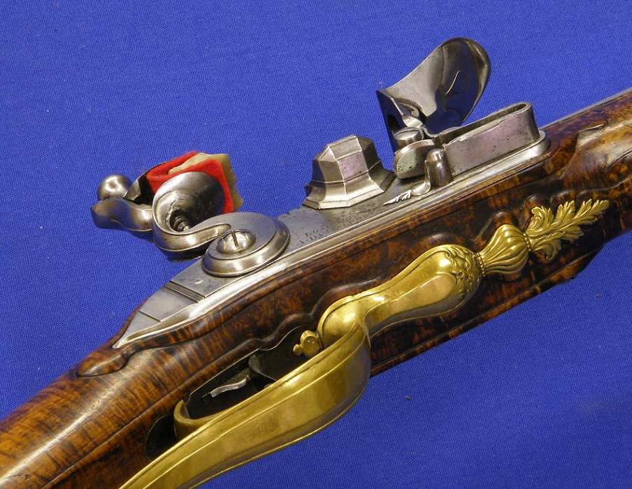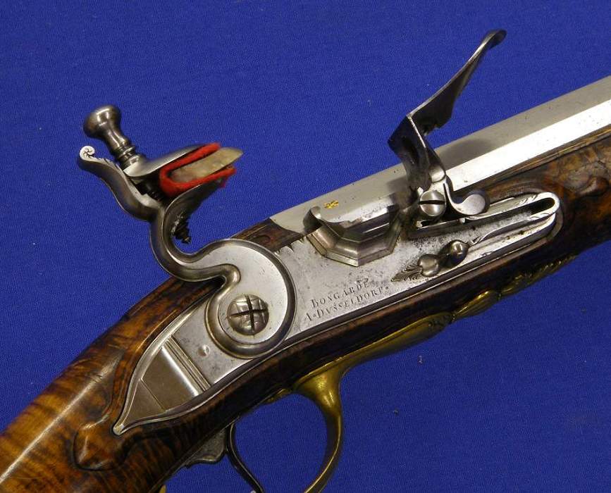 Otro rifle aleman de llave de silex por el famosisimo armero Bogarde a Dusseldorp, aproximadamente hacia 1.730, calibre 17 mm. y un largo de 151 cm. En muy buenas condiciones. La placa de la llave esta firmada por el mismo, y klos aparejos en bronce con restos de hilo de oro.