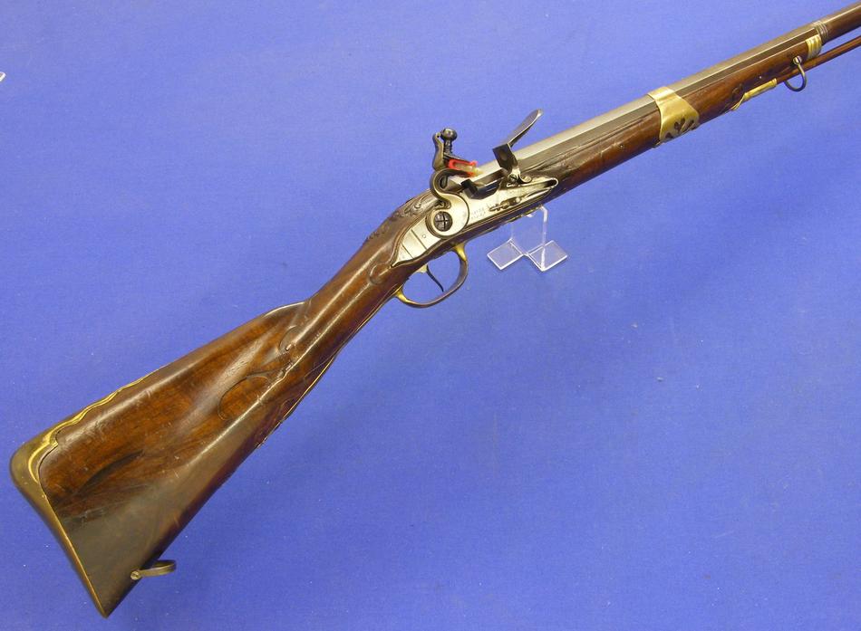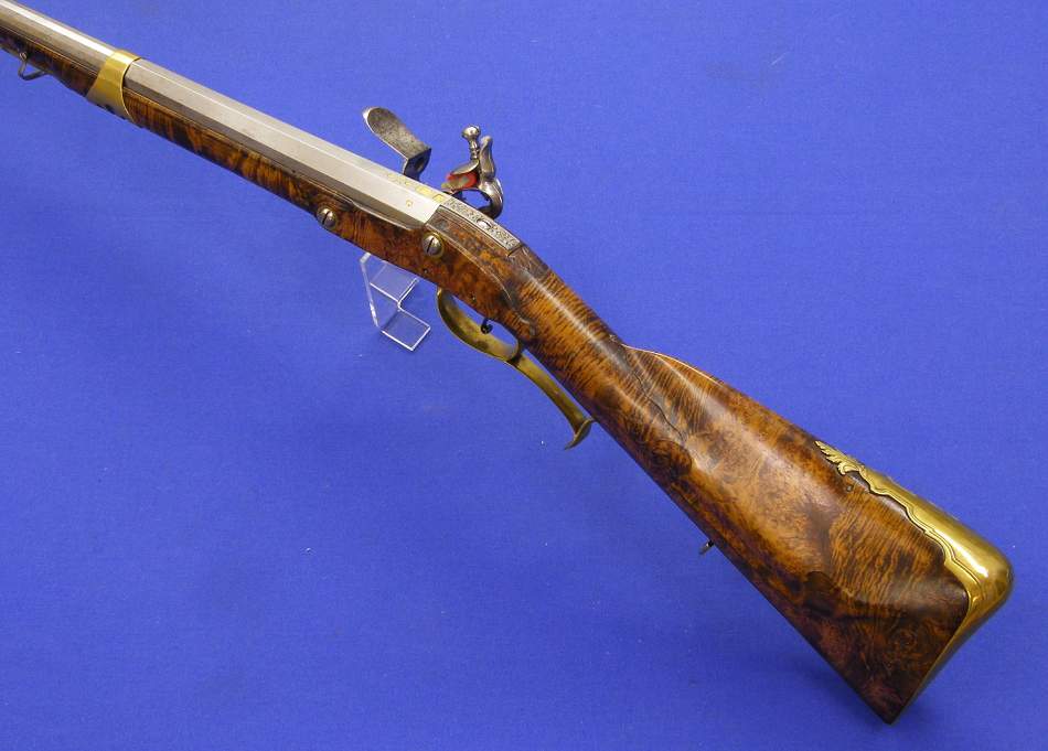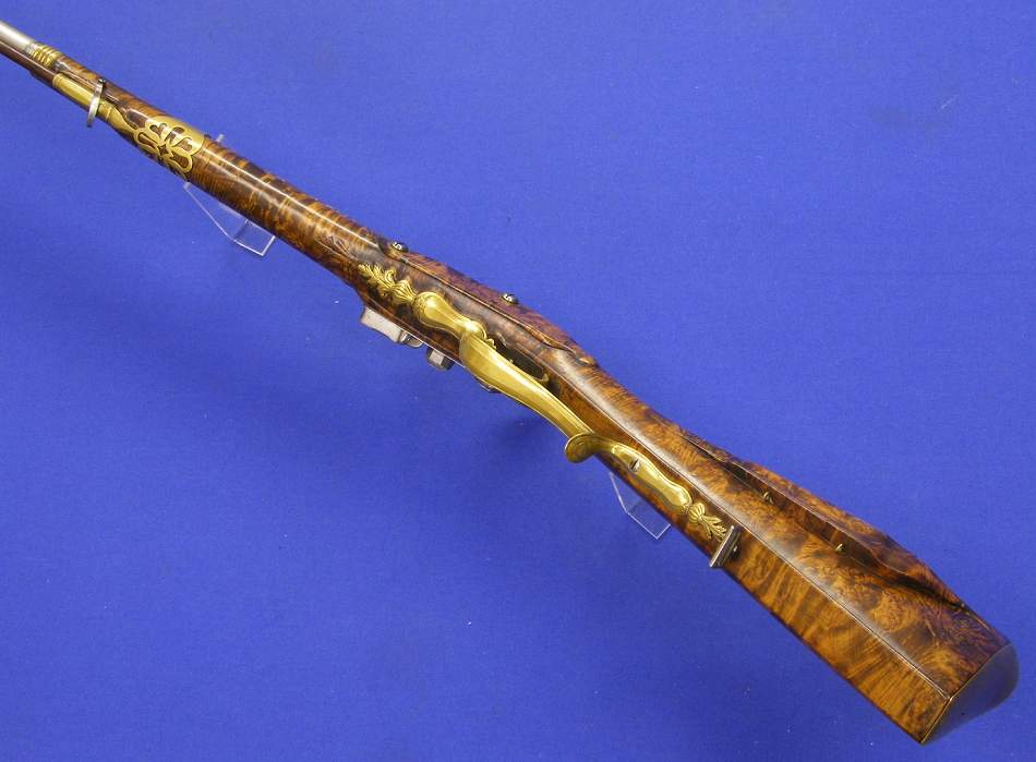 Un precioso rifle aleman de silex por Bogarde de Duseldorf, sobre 1730 en calibre 17 mm. y 145 cm de largo.