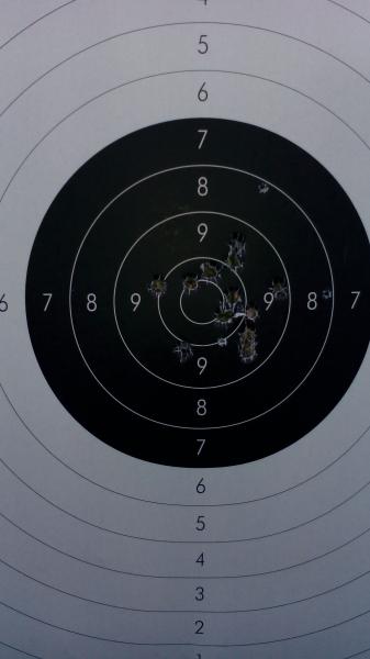 Continuo dandole al 9 a la derecha siguen entrando en esa zona, corrijo ligeramente el diopter y cuando estoy cargando, se colocan detras de mi una serie de "espectadores" que les llama la atencion lo de la avancarga,suelo colocarme tapones de silicona y cascos pero cuando voy a sacar el tiro la gente esta hablando y en tonos altos hay otro tirador con un nueve mm. y zas!!! le pego al 7 y 25, me muerdo los .....y comienzo a concentrarme que es lo que tenia que haber echo, un diez centrado, nueves, un ocho a y media que lo canto y los dos ultimos dos dieces pegaditos total 94.Me quedo como hace un mes, ni subo ni bajo.Temperatura ambiente 4ªC, se agradece la chaqueta.