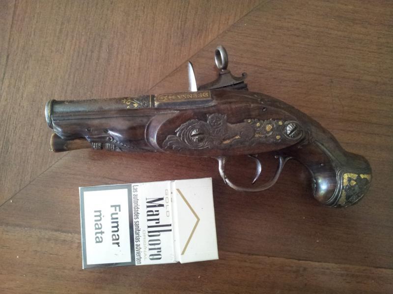 Muy bonitas pistolas. Son de silex y de llave a la española o de patilla. Son armas de grueso calibre, posíblemente del 50, y de las llamadas de viaje o de bolsillo. Por el tipo de cañón parecen de manufactura española. El nombre del armero, parece que es un tal Doleño, pero yo no sé nada de él. Acaso algún otro forero te de mas noticias.