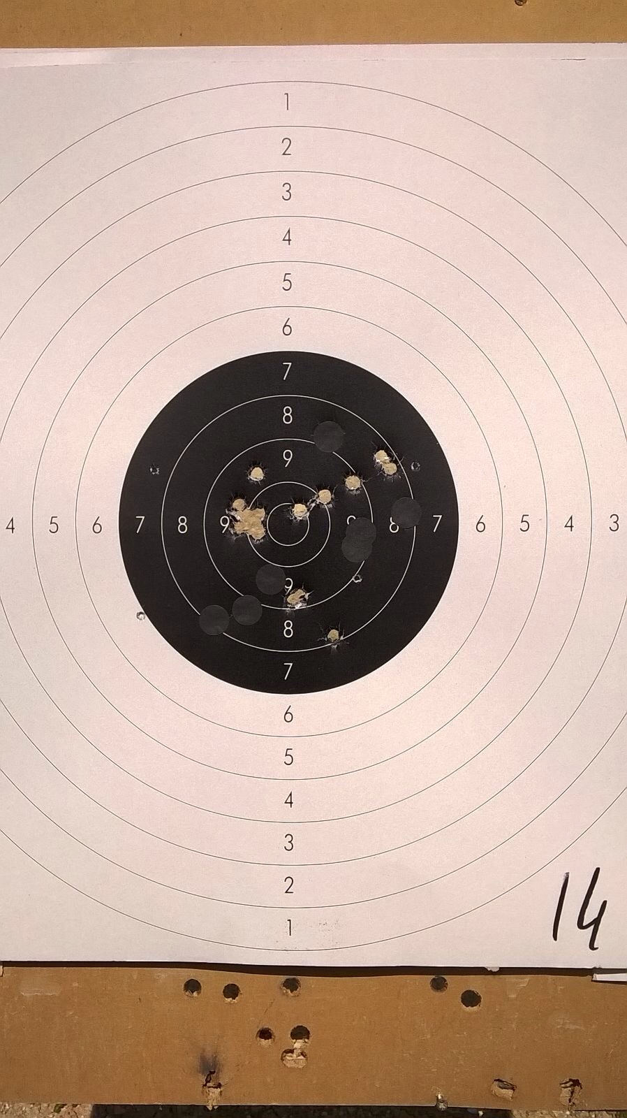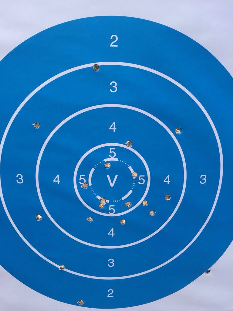 Por razones que desconozco el tiro se me iba sistemáticamente a la derecha y algo alto, por lo que tuve que corregir el punto del blanco para apuntar con lo que la precisión en altura sufría mucho ya que al quedar desplazado del negro del blanco la referencia era complicada. No fue una mala tirada pero demasiados disparos altos y bajos con lo que me comí unos cuantos ochos con solo un par de dieces