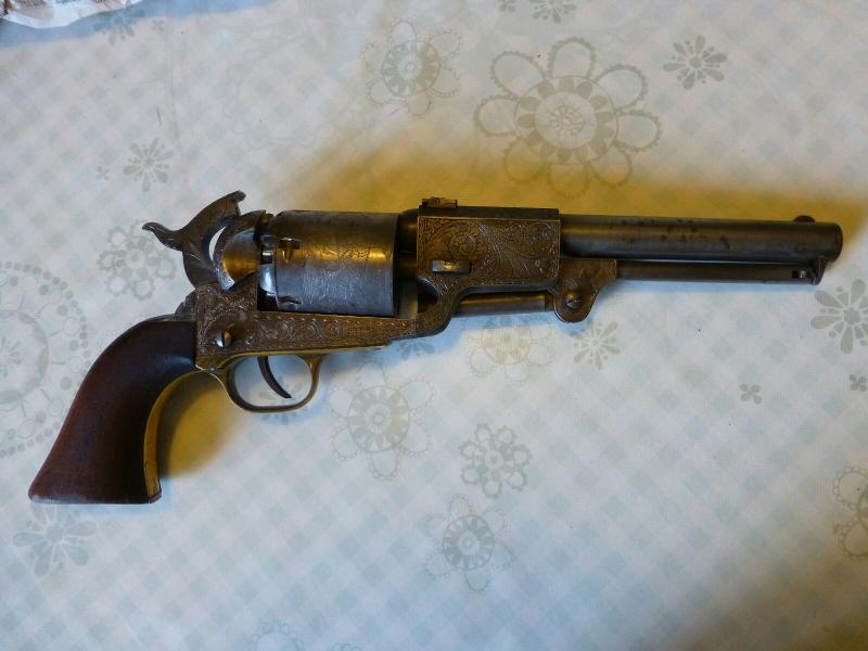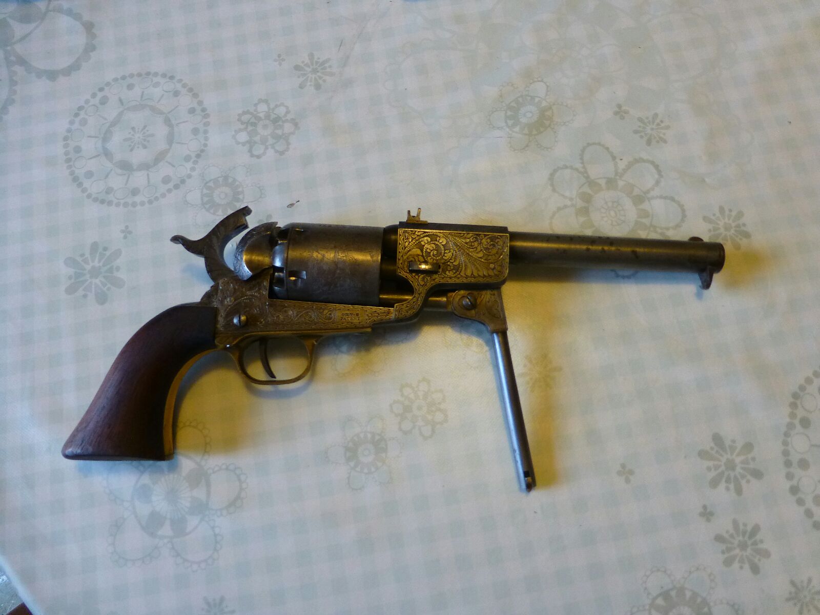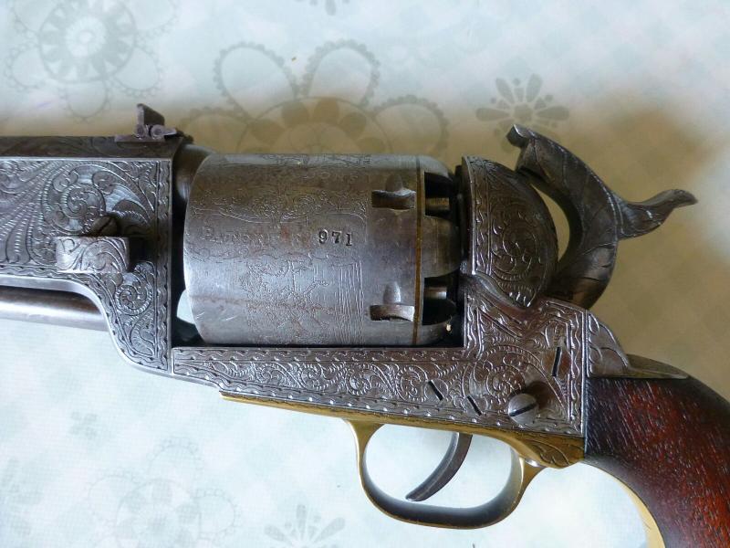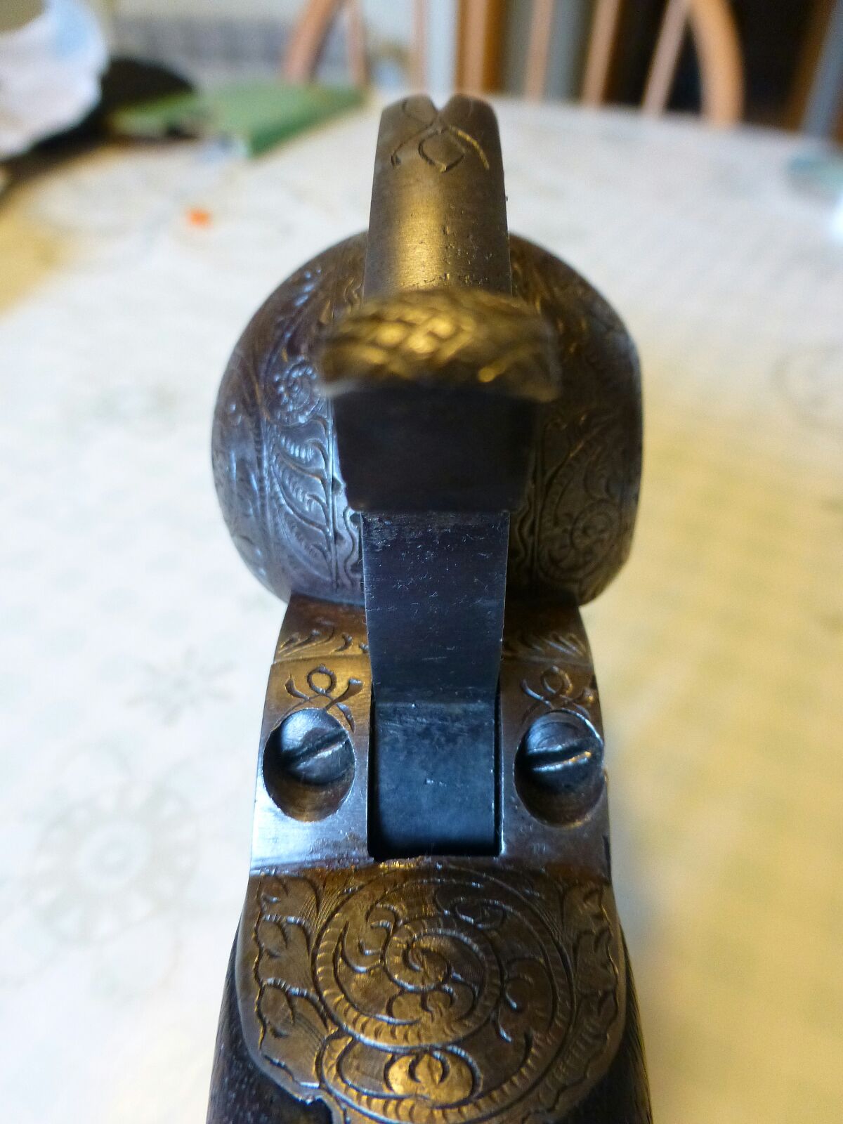 En estas webs, tienen un montón de fotos muy buenas de otros cuatro o cinco ejemplares, con gran resolución y de todos los rincones del arma. No parece que el formato de las letras de la leyenda encima del cañón sea el mismo. En el primero las iniciales de cada palabra son más grandes, en los colts originales son todas iguales, y además en el primero falta o no se aprecia la L que debe ir detrás de SAM :