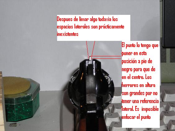 Este problema de mi revolver ya lo expuse en otro hilo y al igual que tu otros foreros me dijeron que no tocase el alza pero si no toco el alza ¿cómo puedo conseguir algo de luces laterales? El punto no se puede limar lateralmente es demasiado fino . En altura no hay problema, la iré quitando progresivamente, pero no antes de conseguir unos espacios laterales que me permitan ver el punto sin tener que elevar el cañón y verlo sobresalir por una línea recta, que es ahora mismo el alza. Muchas gracias de nuevo por tus consejos algunos no los había tenido en cuenta como el de aumentar la carga. Lo del glassex lo desconocía y lo voy a probar . Adjunto pongo una foto donde se puede ver que la anchura del alza prácticamente es la misma que la del punto y eso que ya he empezado a limarla. Si se te ocurre alguna solución, por favor, házmelo saber.