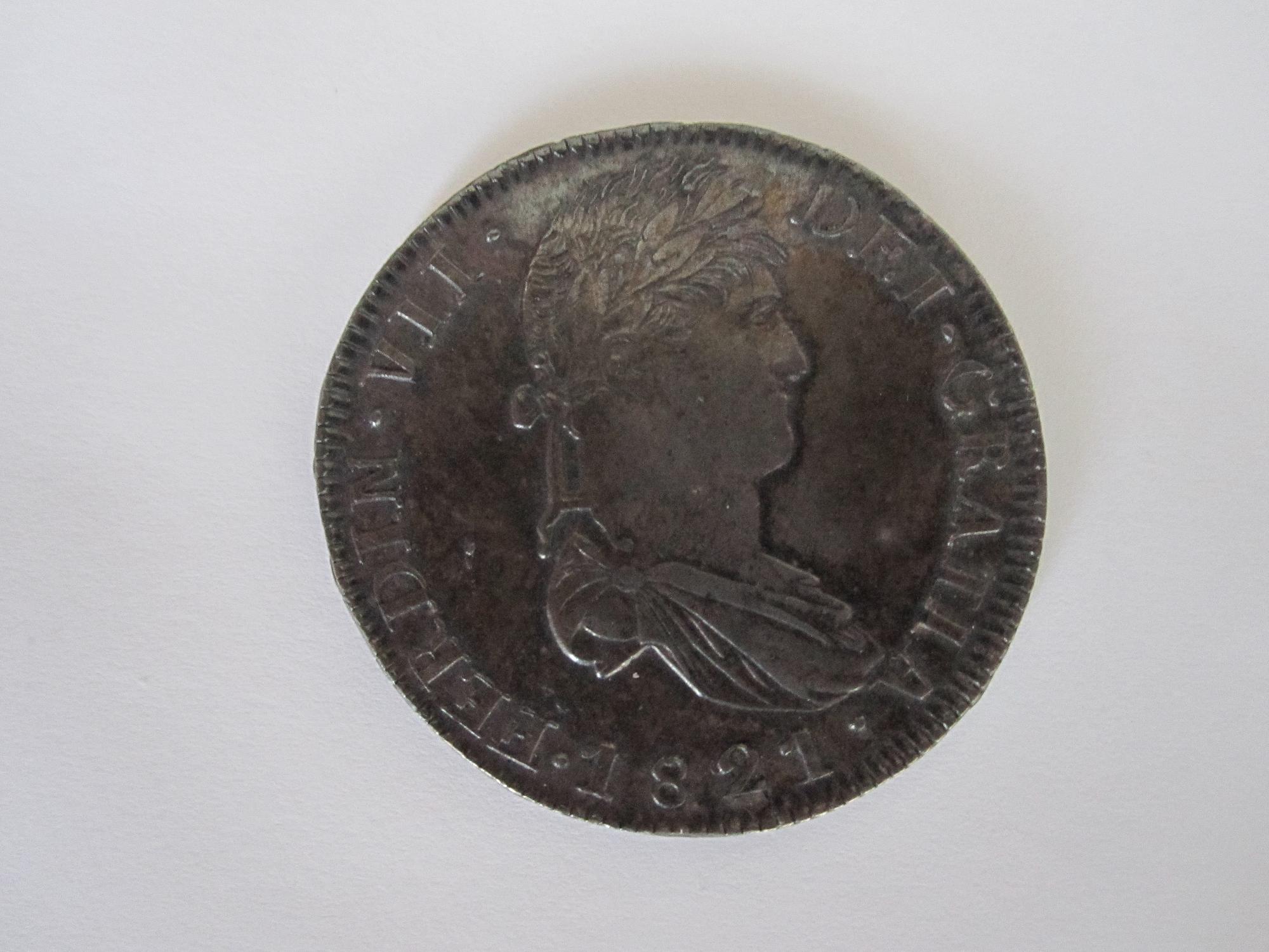 A la espera de que nos pongas imágenes de aquella moneda te dejo aquí una de 8 reales de aquel monarca. Curiosamente lleva la ceca de Zacatecas y es del año 1821, precisamente la fecha de la independencia de México. Sería una de las últimas que se acuñaron allí, pero esta es otra historia.
