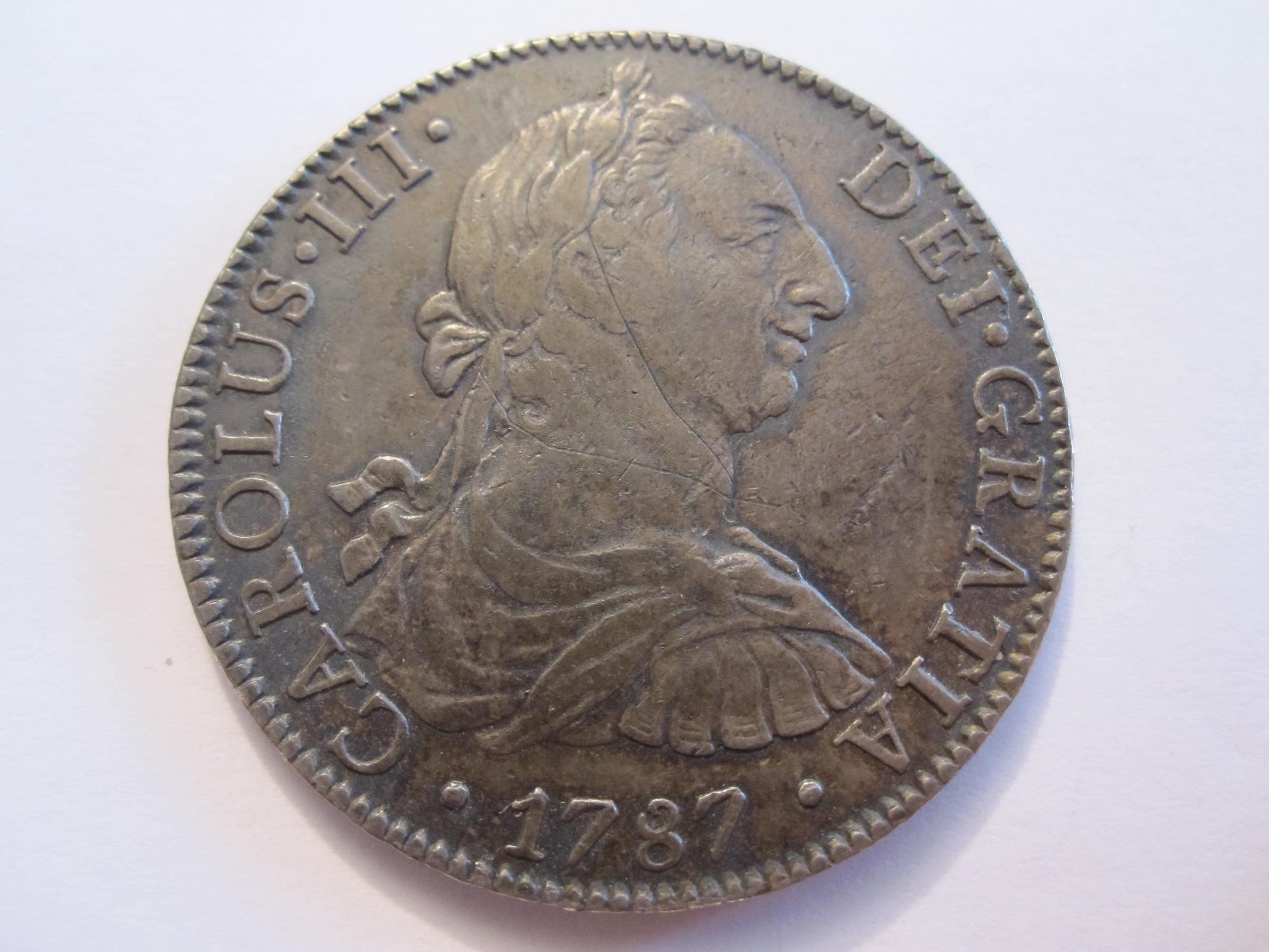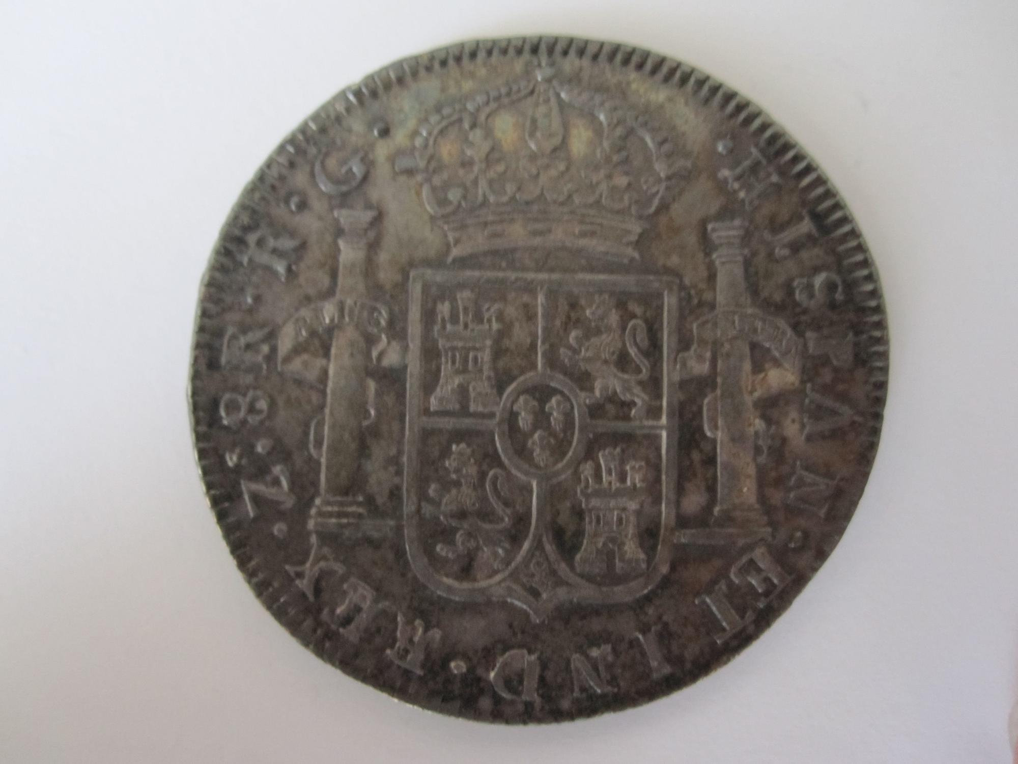 Y aquí la de 8 reales de plata,cuyo valor facial, peso y dimensiones son idénticas a las de la moneda de su nieto que vimos más arriba, con la diferencia de que esta lleva la ceca de México.
