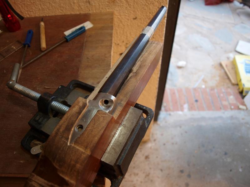Ahora hay que ir bajando poquito a poquito todo el bloque cañón-culata sin perder el ajuste, unos 6 mm aproximadamente a base de cuchilla, limitas y gubia.