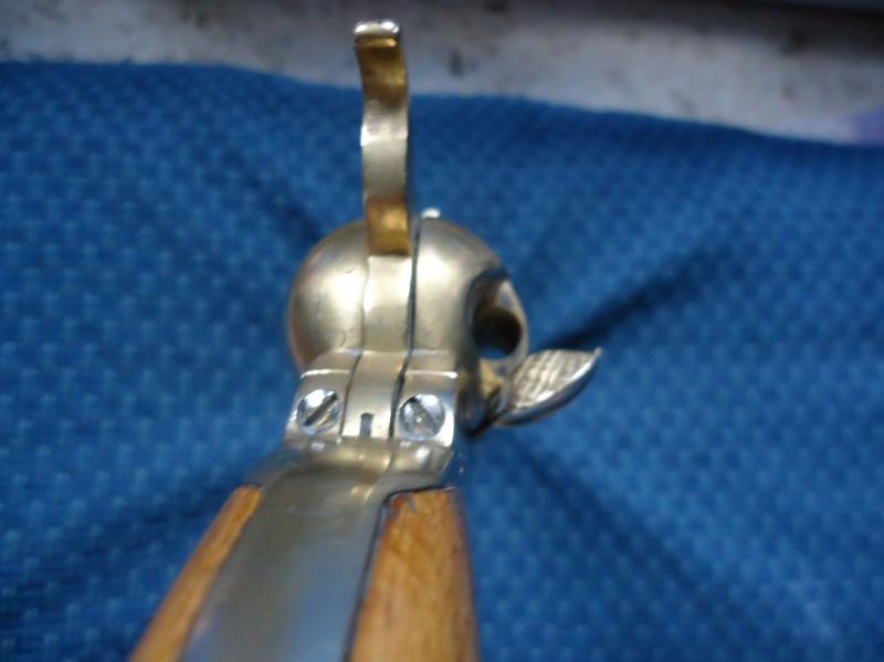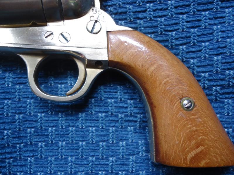 Os recuerdo que el Navy está totalmente inutilizado, el cañón está fresado a todo lo largo por debajo de la palanca de ataque, el martillo limado y es muy pequeño, creo que no llegarón a hacerle espacio en el interior para instalar los mecanismos necesarios para su funcionamiento y lo que se ve detras del tambor simplemente es una pieza de adorno, lo he desmontado y es solo un pieza plana, ni el martillo, ni el gatillo hacen su función, es simplemente una pieza de decoración, pero cuando menos curiosa.