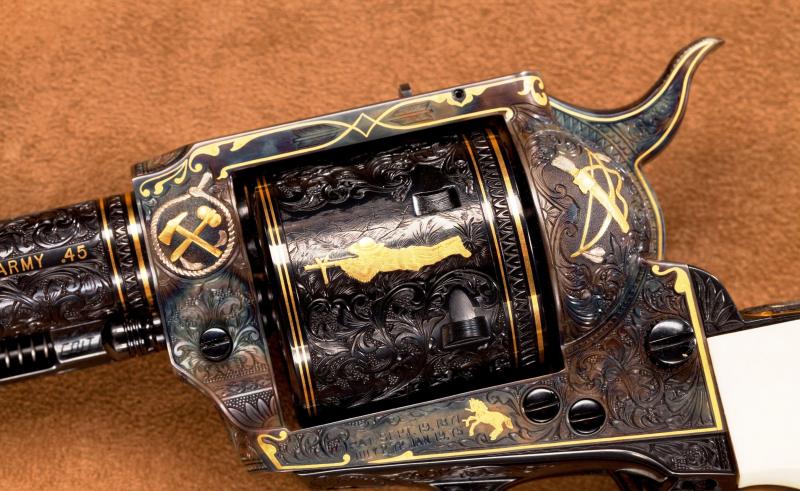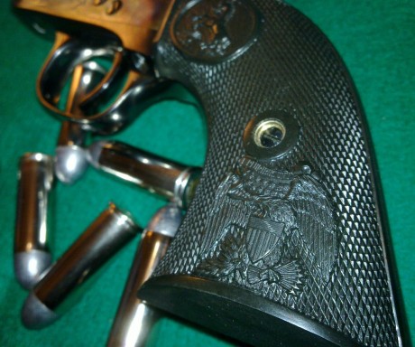 Es una lastima que el post corte las fotos, pero creo que se puede apreciar bastante bien su bonita empuñadura nacarada con el medallon Colt y el intensisimo pavonado negro de Colt con preciosos detalles de piezas chapadas en oro de 24k.