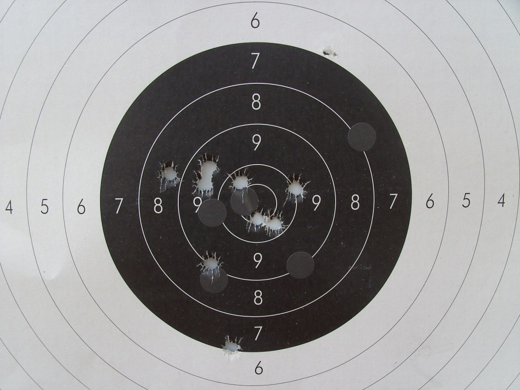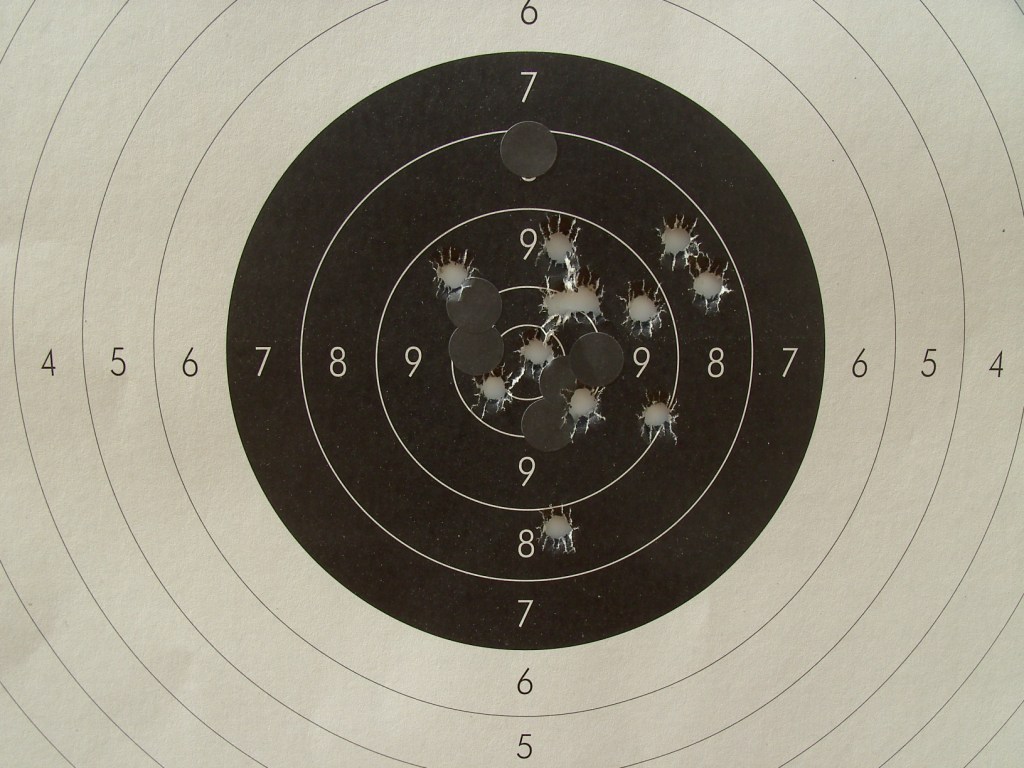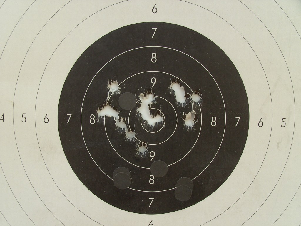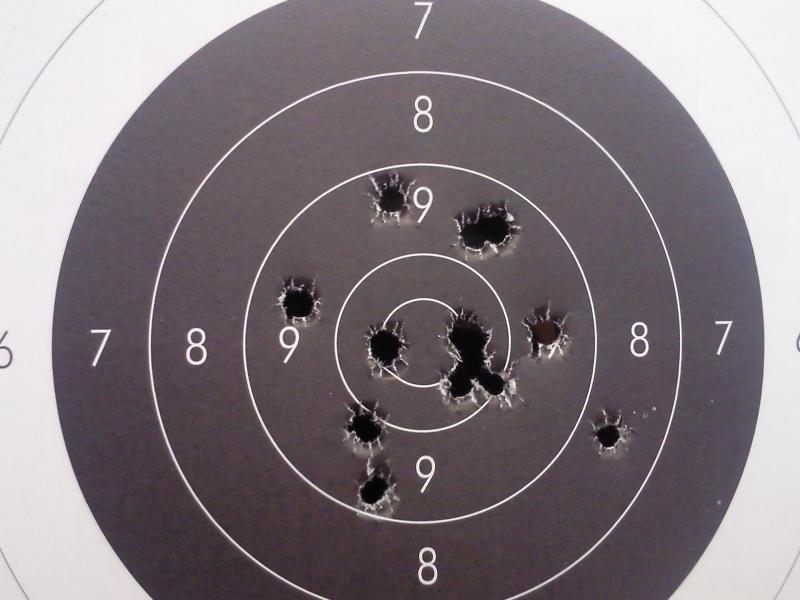 Tanto la tirada del martes pasado como la media de hoy que he tirado con gafas veía el blanco totalmente ahuevado (en el eje horizontal) y es muy probable que por ahí vengan las pegas de tiros a un lado y a otro.