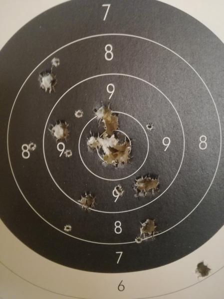 Yo he estado tirando con miras abiertas a 100 y en el blanco de pistola UHT. Y la verdad que se hace un buen entrenamiento y economico. Y de pie a 50mts.