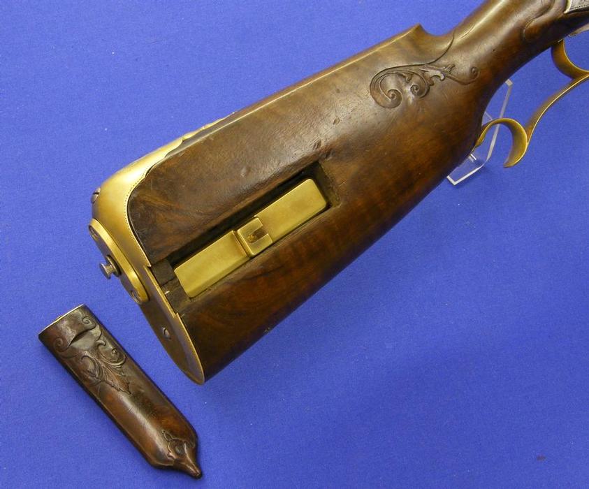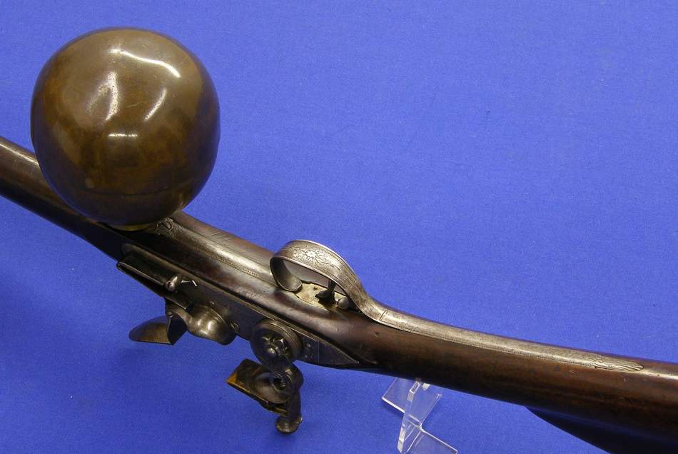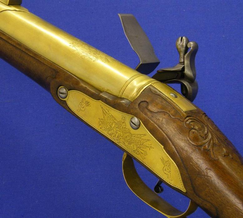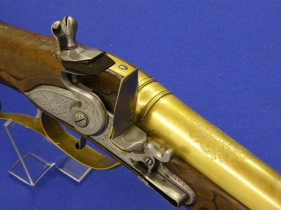 Muy bonito y raro ejemplar de rifle frances de aire con deposito de aire alrededor del cañon, firmado por Savi Paris, (1750), calibre de 9 mm, largo de 110 cm, en estado ideal. Todas laas partes estan finamente grabadas. La bomba se encuentra alojada en la culata.