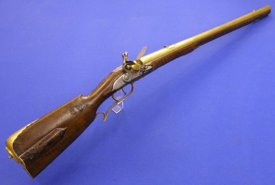 Rifle de muy alta calidad para tiro deportivo del siglo XVIII (mediados de siglo) con llave de silex, de caja larga de madera dando cobijo a la baqueta, firmado por Bongarde a Dussldorp con, un pedazo de cañon español de Alonso Martinez, en muy buenas condiciones, calibre 16 mm3. y una envergadura de 150 cm.