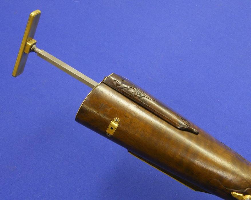 A very nice and scarce French Airrifle with a reservoir around the barrel, signed SAVY PARIS (1750), caliber 9 mm, length 110 cm, in mint condition