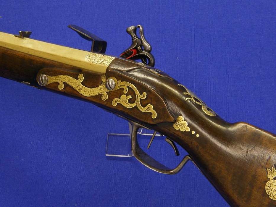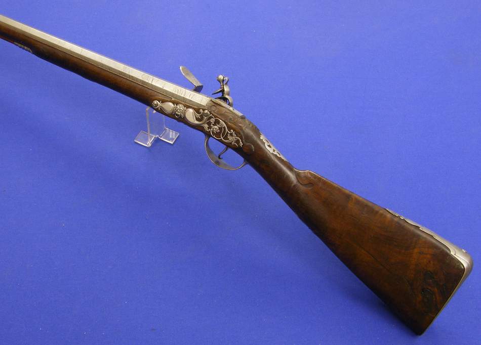 A very nice French Flintlock Rifle by JACOVE PENEL LAYNE (St. Eitienne), circa 1720, with a Spanish Barrel by Antonio Comas Ripolli, caliber 16.5 mm, length 166 cm, in mint condition