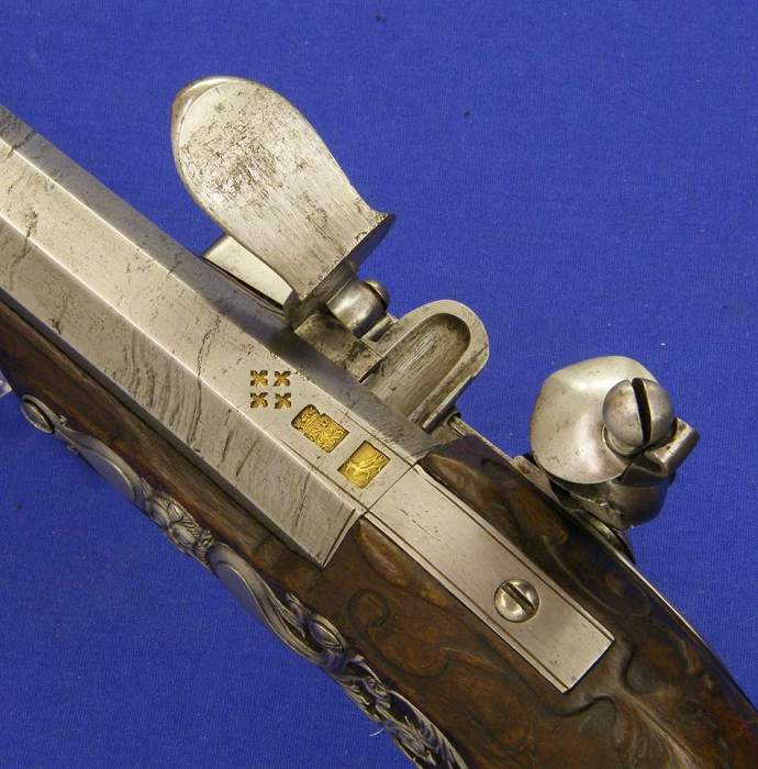 The Rifle is signed by Penel on the lockplate under the cock. The damast barrel is signed with two goldmarks from Antonio Comas.