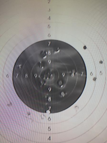 Pues, efectivamente, es más que posible que el lote de proyectiles que venía usando para el Hawken tiene algún problema, porque hoy tras empezar agrupando a la izquierda y tras una corrección ha ido a su sitio, si hubiera sido una tirada habría 94 puntos que sin ser una marca estratosférica, hubiera sido bastante mejor si hubiera empezado a agrupar en su sitio.