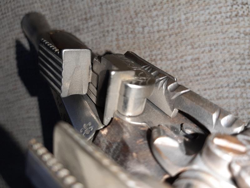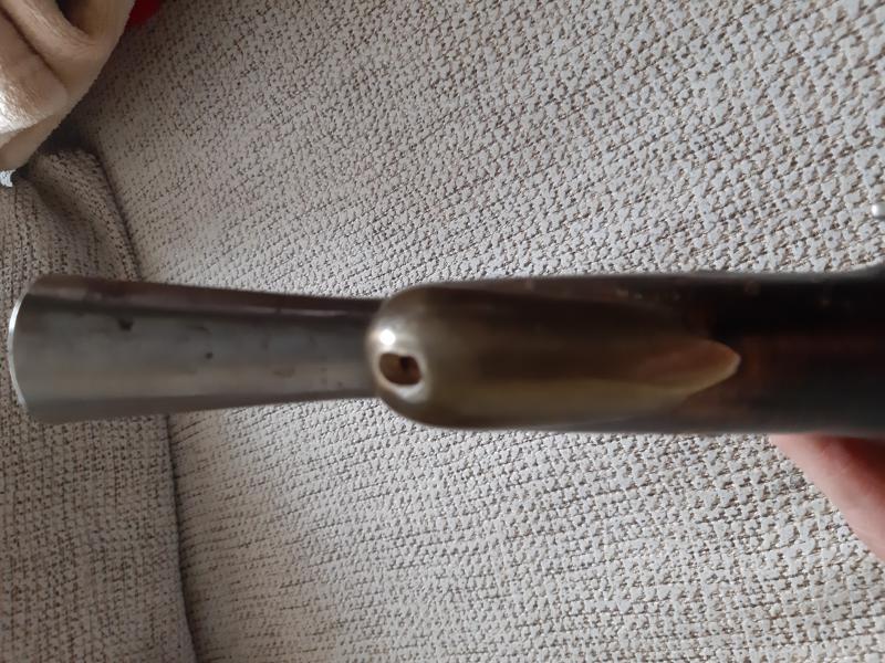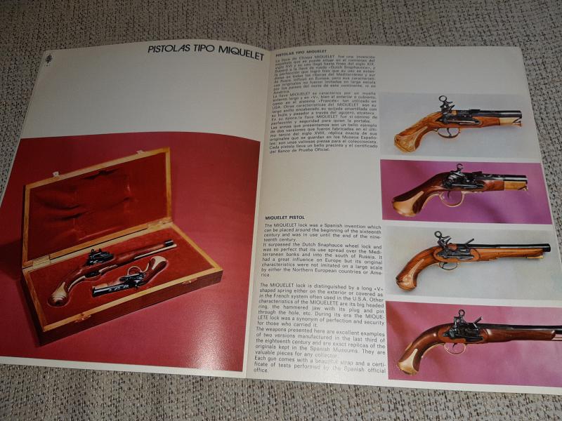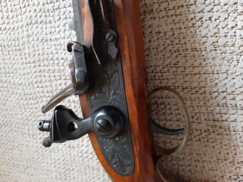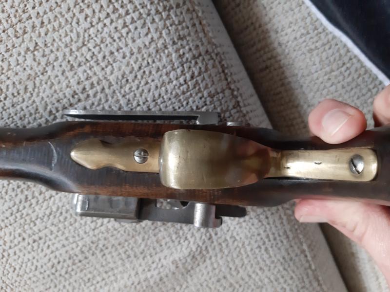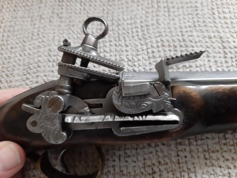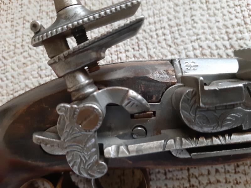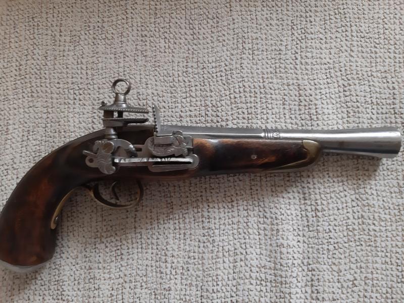 Hola. A ver si algún compañero puede ayudarme a identificar esta pistola de chispa. Creo que puede ser reproducción por lo que me comento su antigua dueña que me comento que fueron regalo a su suegro en una visita a la fábrica de Santa Barbara (luego pondré fotos de la otra) más un catálogo. El oído comunica con el cañón, el martillo tiene posición de seguro y disparo,no es calamina y sin marcajes modernos. Si alguien puede decirme algo se lo agradecería.