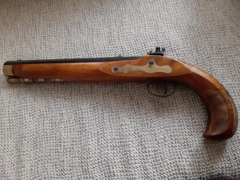 La otra pistola que también le regalaron en Santa Barbara es un modelo Kentacky con cañon estriado. La única leyenda que pone y mal puesta es "madera in spain".