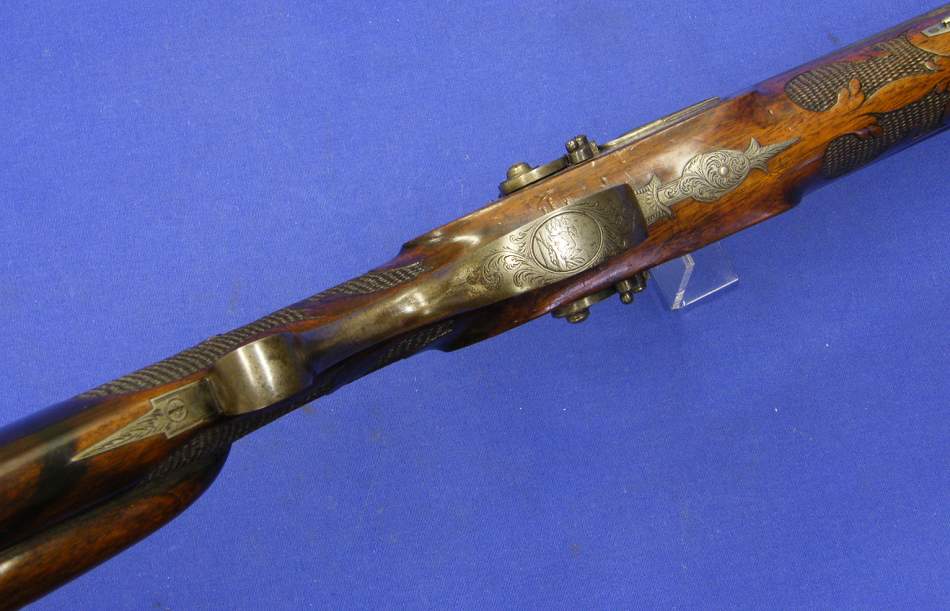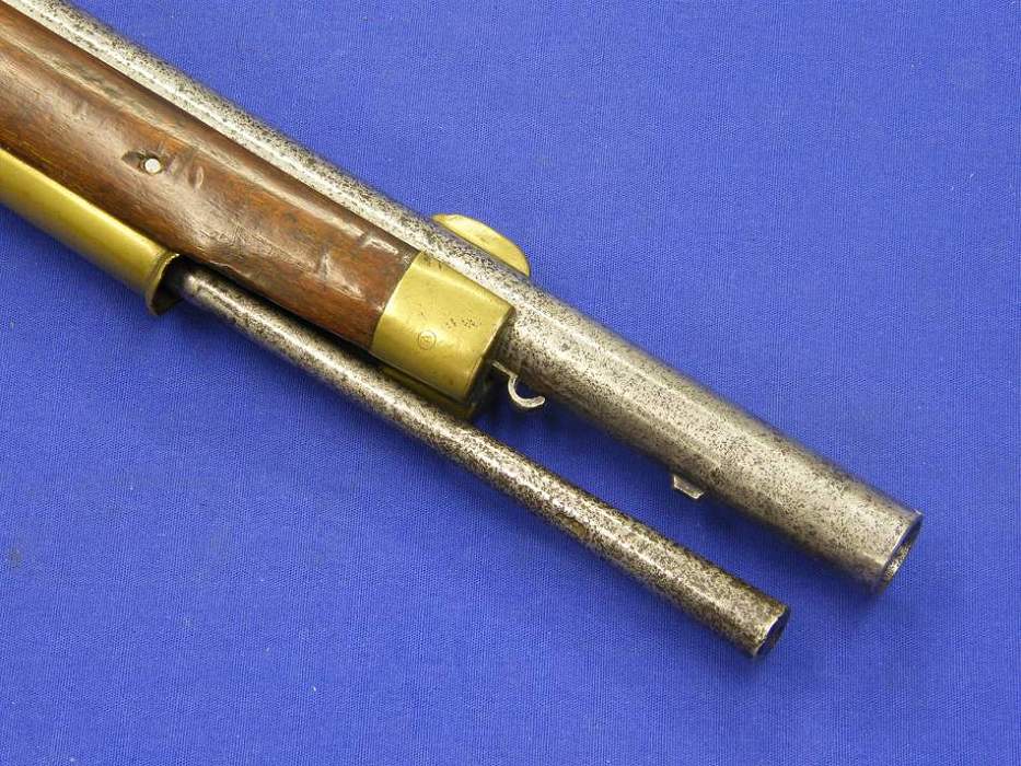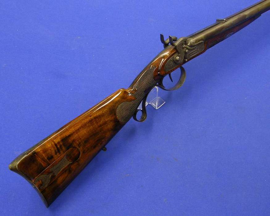 Un bello rifle aleman en percusion con doble cañon firmado por A.Dickoré in Giessen, calibre de 14 mm. y un largo de 117 cm.