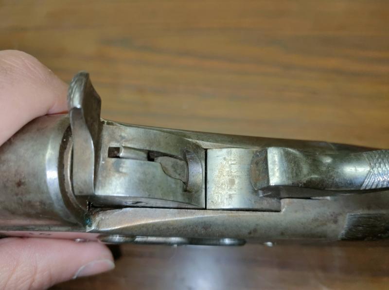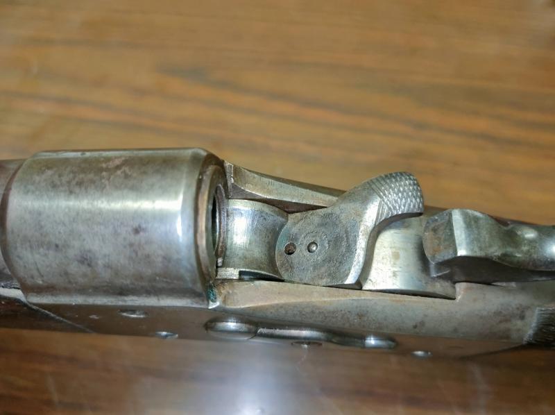 Aquí se puede ver la recamara y estriado inicial del cañón, también quizás se aprecie el cambio de fuego anular a central en el martillo.