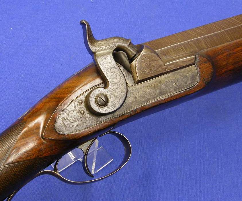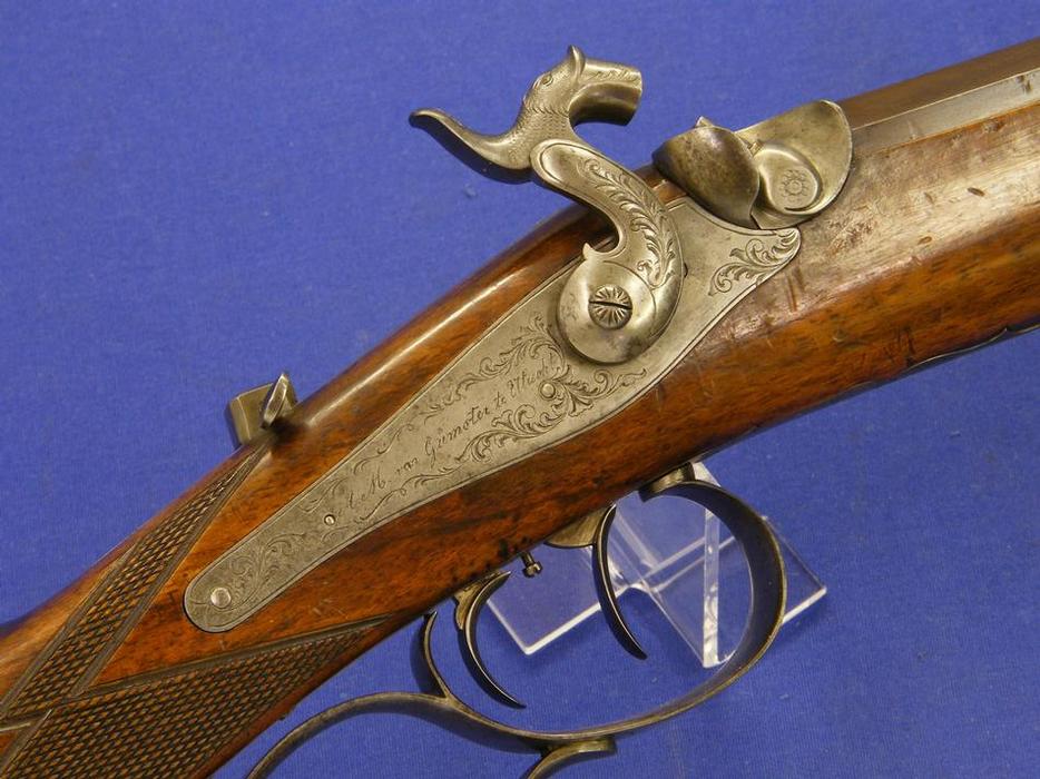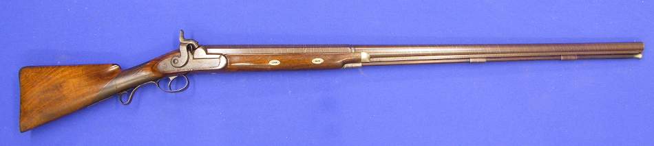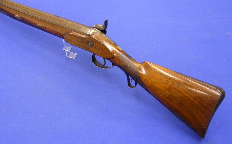Este deportivo y muy pesado fusil ingles de anima lisa tiene el calibre de 19 mm. y un largo de 150 cm. en perfectas condiciones. Tiene en el cañon, parte superior, la incripcion London y en la parte inferior, las marcas del banco de pruebas de Birmingham, I.W. y tambien TWISTED.