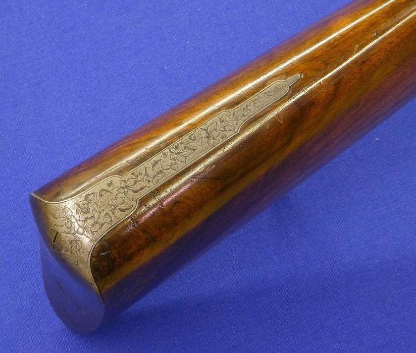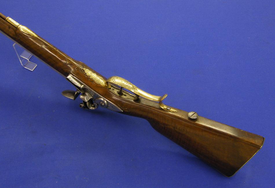 On the original browned damast barrels are signed Gastinne Renette Arq., de L' Empereur a Paris. Locks signed Gastinne Renette. All iron parts are very fine floral engraved. Caliber 17 mm, length 114 cm.