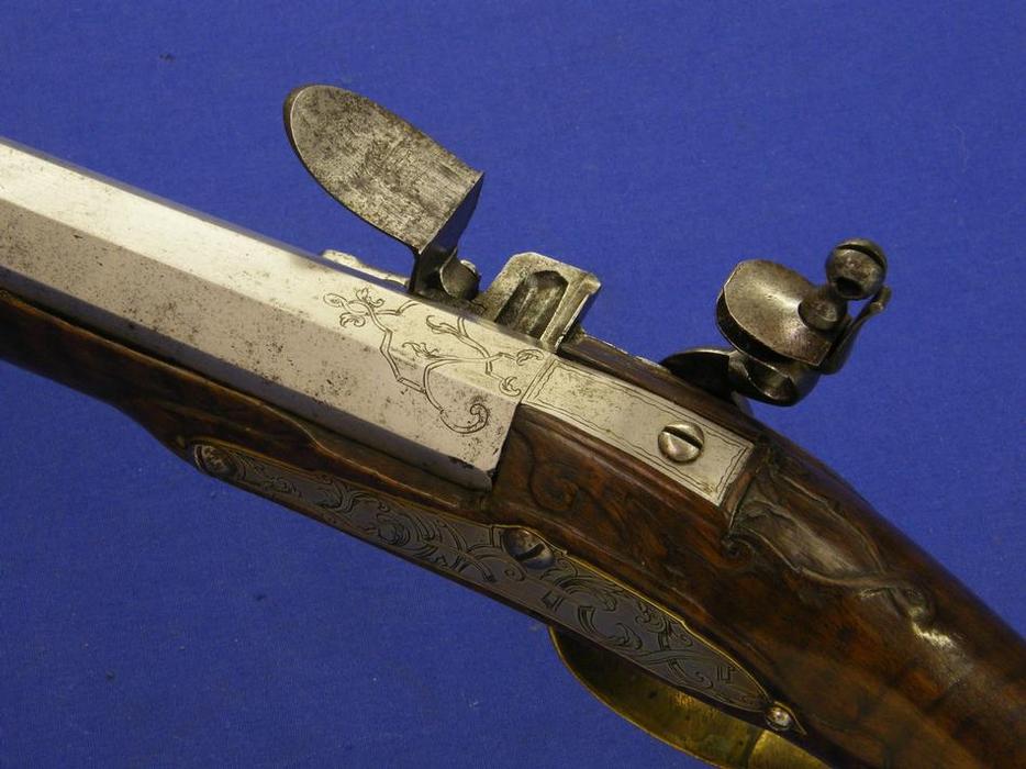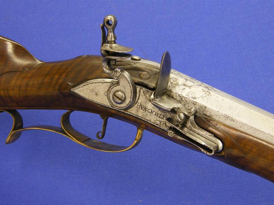 Un trabuco de silex aleman, muy bonito, firmado por HUNCKHLINGER, sobre 1730, longitud de 98 cm. en muy buen estado.