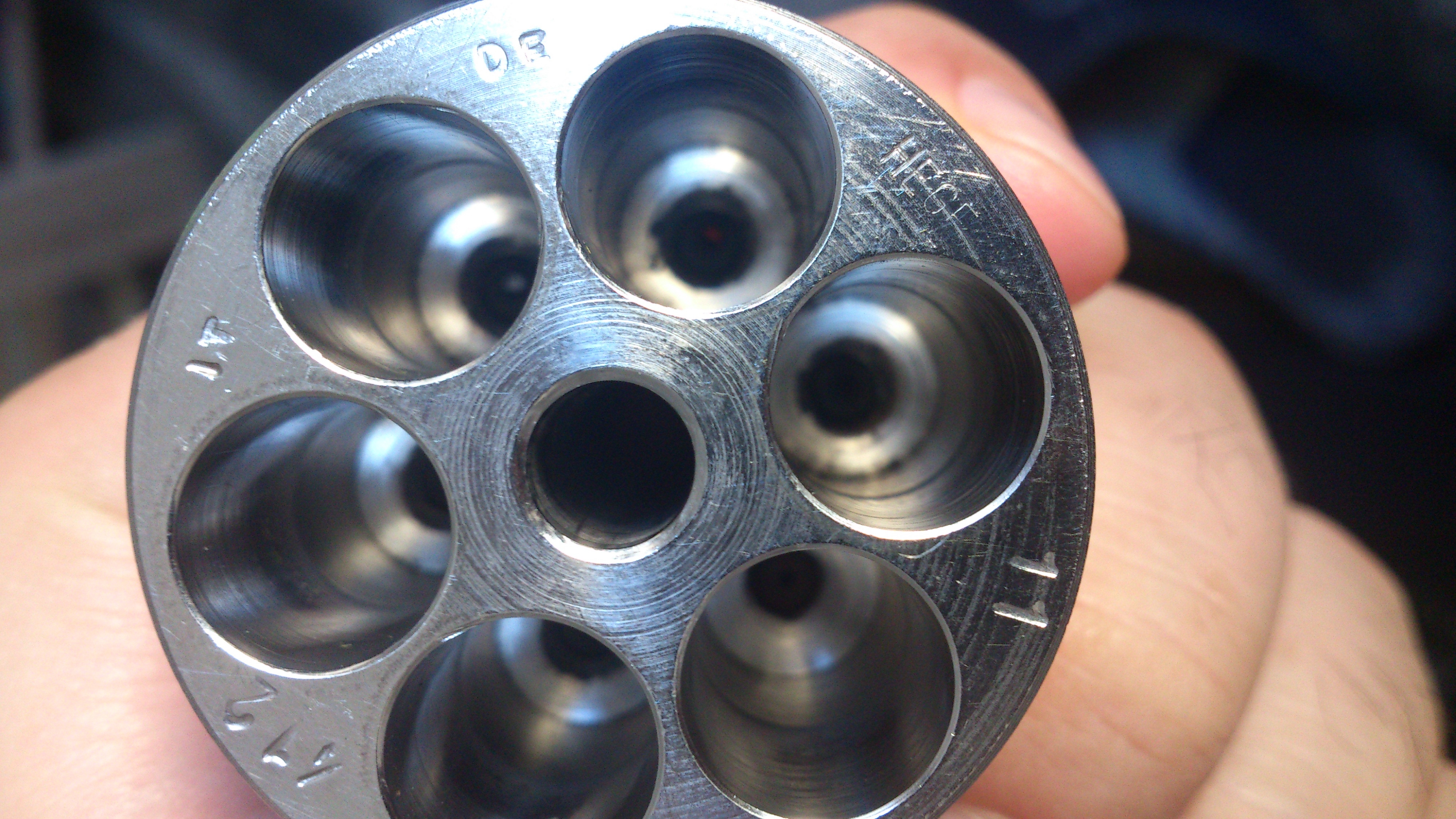 Pudiera ser que el desgaste de los alveolos que comentas se deba a que el empujador del proyectil roce con las paredes de los mismos al cargar el revólver debido a que no estén perfectamente alineados? Si el material del empujador es más duro que el del cilindro, puede ser la razón del desgaste que comentas.