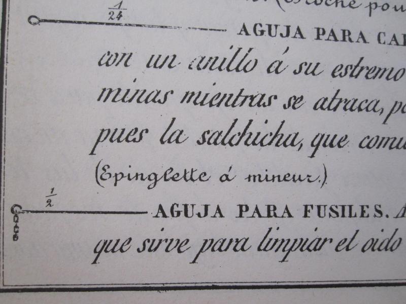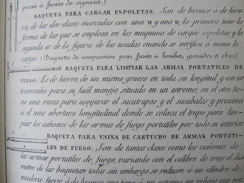 Y en esta última vemos las cargas correspondientes a los diferentes cartuchos reglamentarios, en adarmes, medida antigua castellana. Vease la diferencia entre el cartucho para chispa y el de armas de percusión.