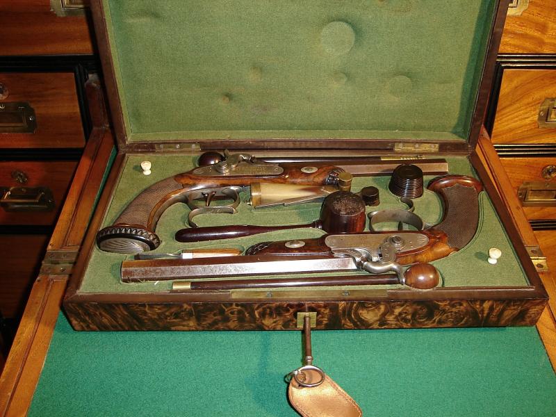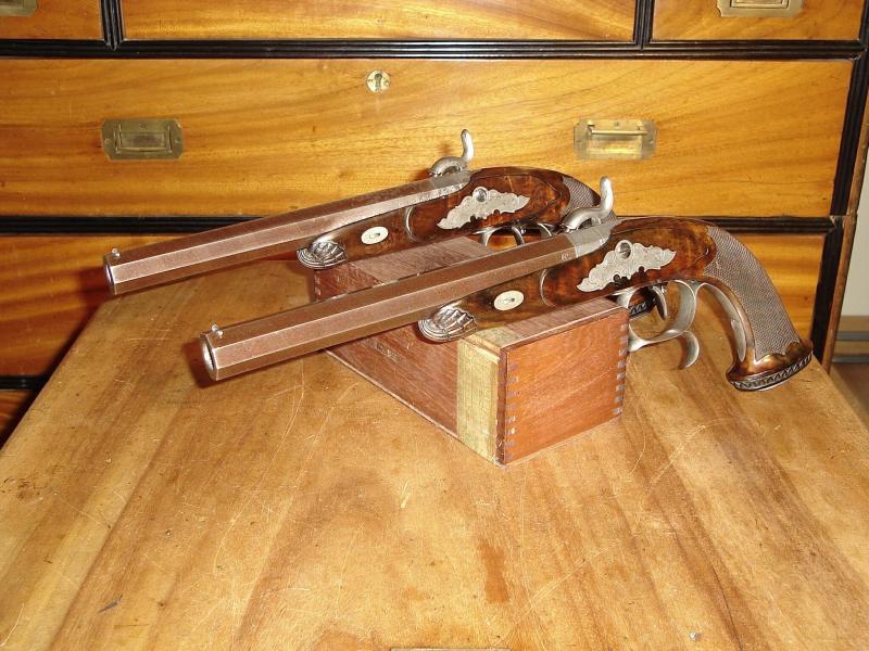 Este juego de pistolas de duelo es un excelente ejemplo de un trabajo bien realizado, cañones en acero Damasquino, que no Damasquinado; Octogonales de 23Cm. Con un diámetro de 22mm. Ánima estriada de 12mm. Fabricados en Lieja seguramente para un encargo especial, Pistolete en madera de raiz bellamente trabajada, caja y guardamontes burilados, gatillo a pelo. Estuche igualmente en madera de raiz con todos sus complementos