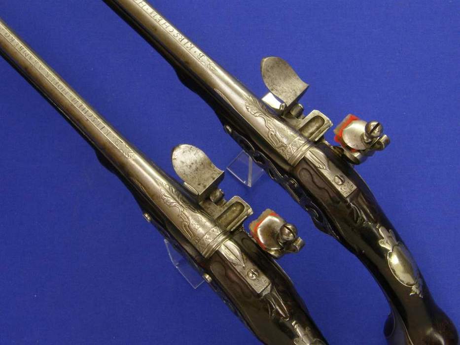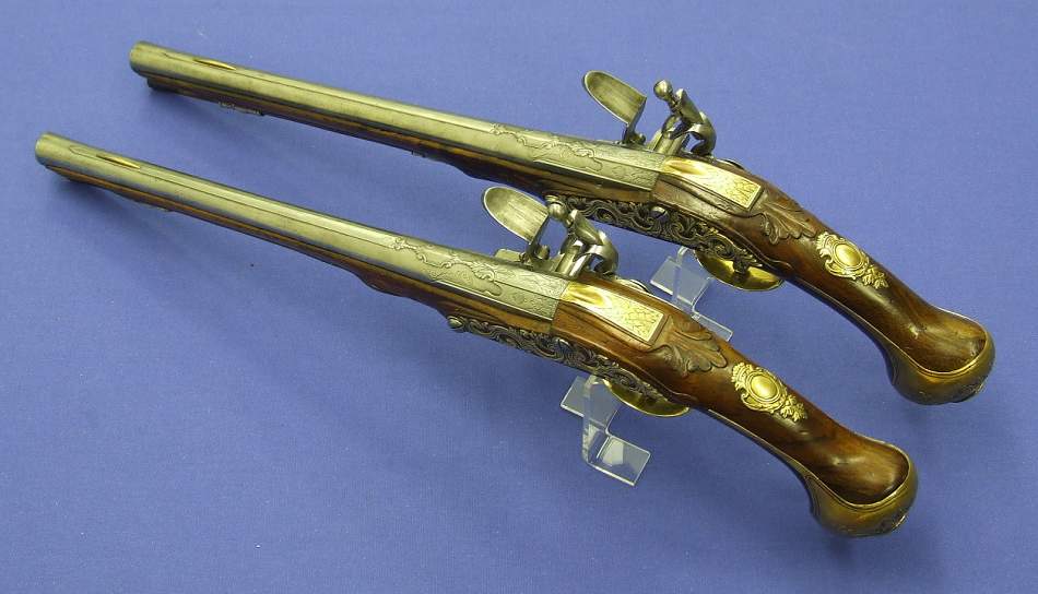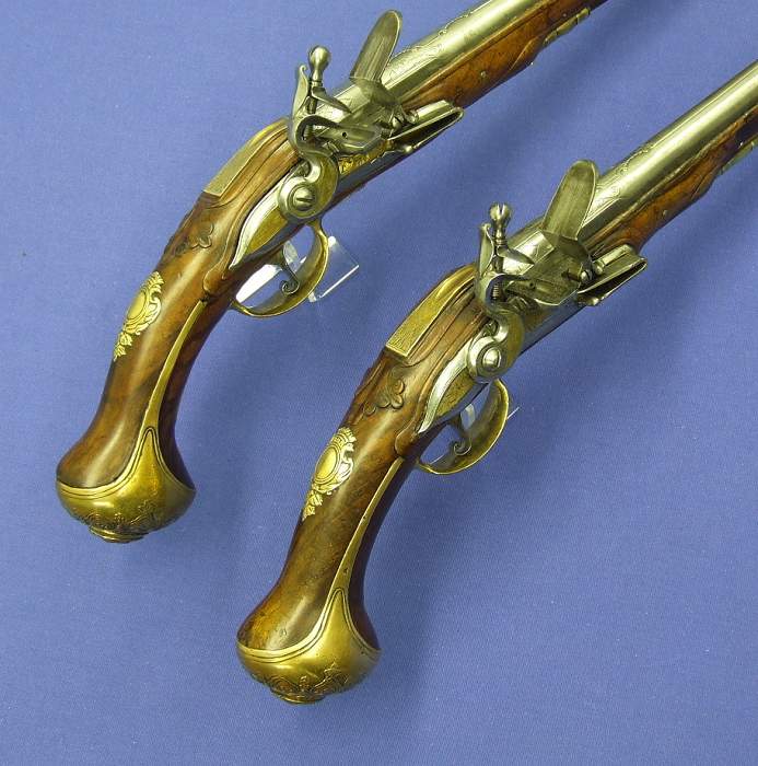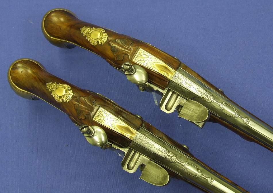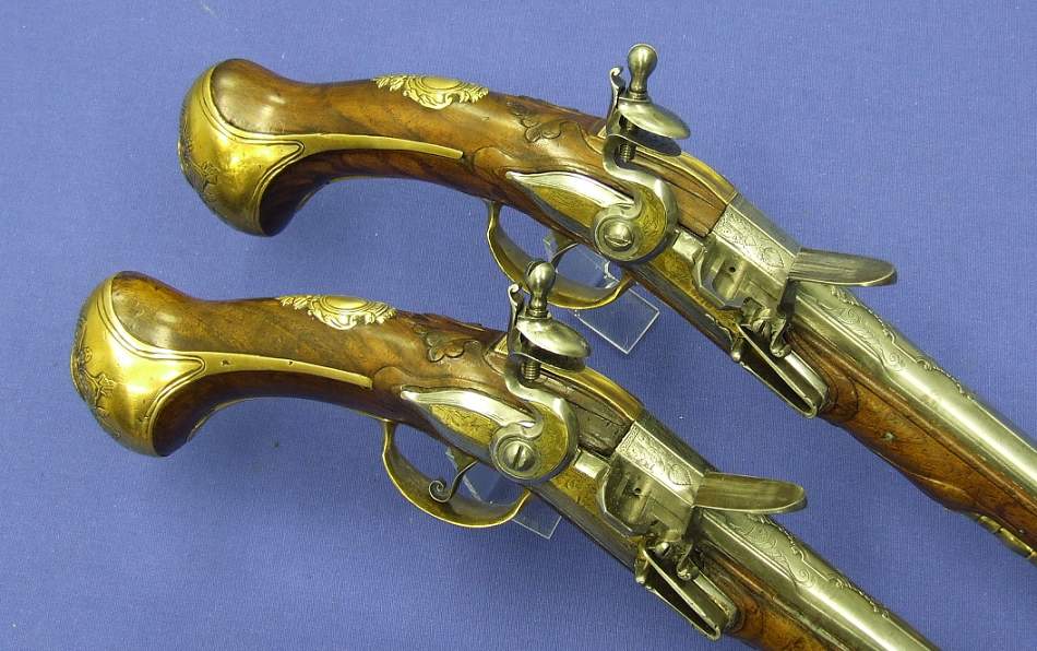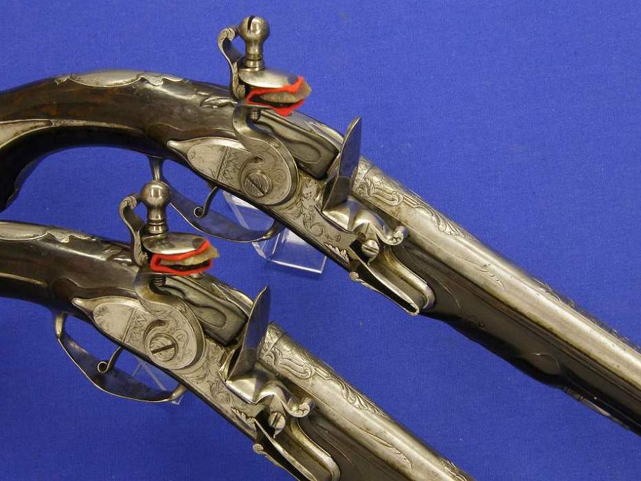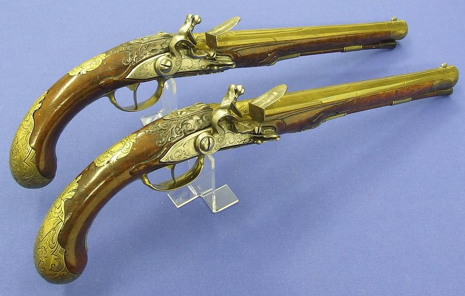 Soberbio par de pistolas holandesas de silex, sin firmar pero indudablemente de Maastricht, con cañones labrados calibre 15/16 mm (osea 15.5 mm de media