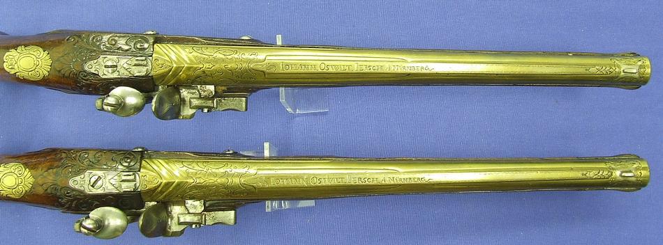 A very nice pair of 18th century bronze barreled Flintlockpistols by JOHANN OSWALT IERSCH a NURNBERG, caliber 15 mm, length 50 cm, in mint condition