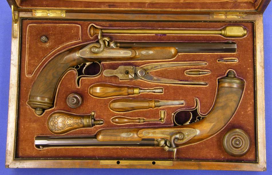 Un bello estuche con una preciosa pareja de pistolas de percusion argentinas firmadas por L. Ambrosini de Buenos Aires en perfecto estado y sin usar, (hay gente pa'todo). Las pistolas tienen miras ajustables. Las partes de acero finamente labradas y con su pavon (creo entender) original. Sobre el azul de los cañones en oro el nombre del fabricante.