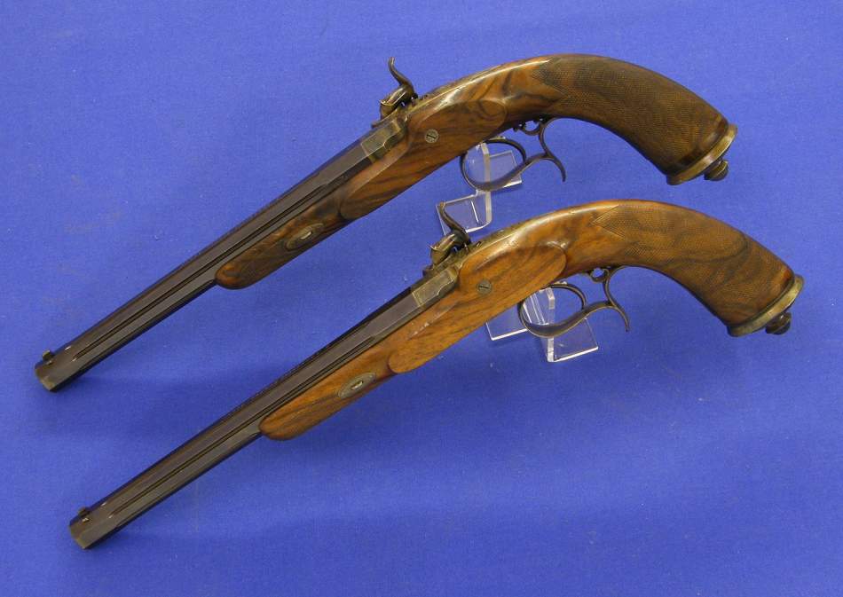 The pistols are in unused condition. The pistols have adjustible sights. The iron parts are veri fine engraved and with original case hardening. The blue barrels are in gold signed with the makers name.