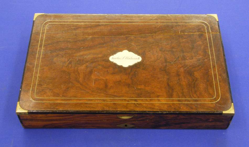 En la placa de plata del estuche el nombre del propietario Nicolas L. Vlahovichque fue presidente del Boca Junior en 1928/1929, en este club jugo, años despues, Diego A. Maradona.