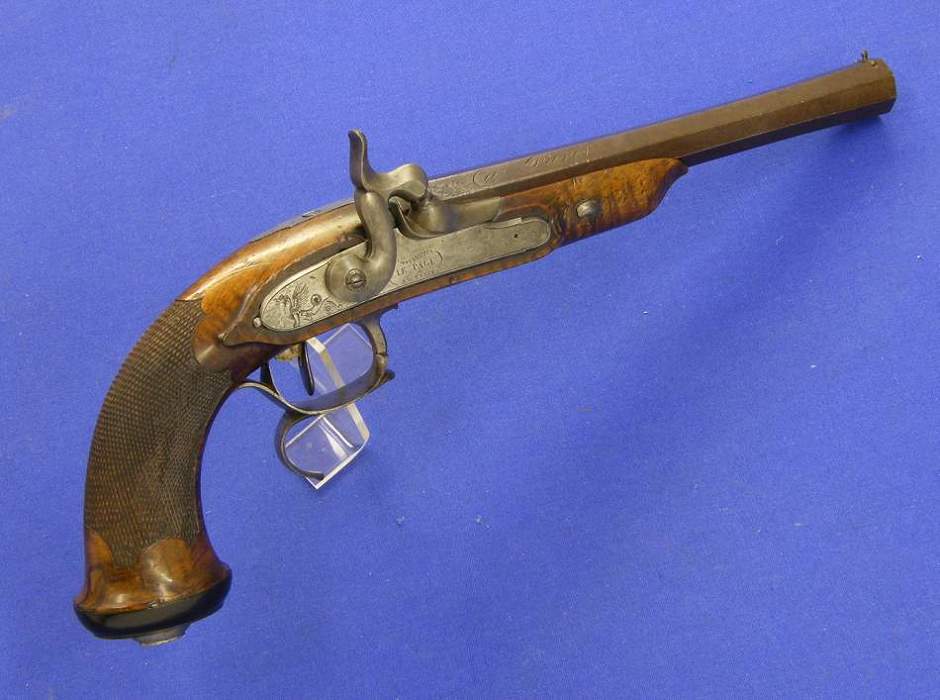 A very nice English Perkussion Pistol, about 1860, by MANTON LONDON, caliber 16 mm, length 38 cm, in very good condition