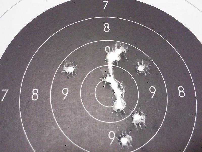 El ultimo disparo en la de la semana pasada fue a parar entre el cuatro y el cinco y me dejo de piedra pues el tiro fue correcto, y cuando vi el impacto no me lo podia creer. Como no fuese que la bala tuviese una burbuja de aire no me lo explico.