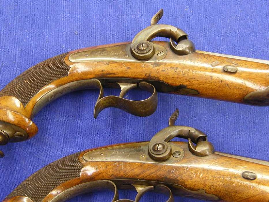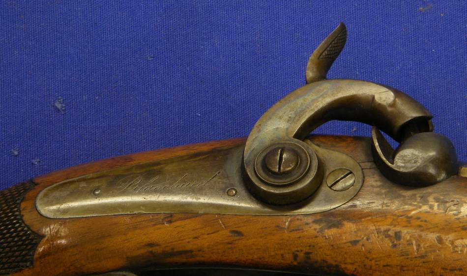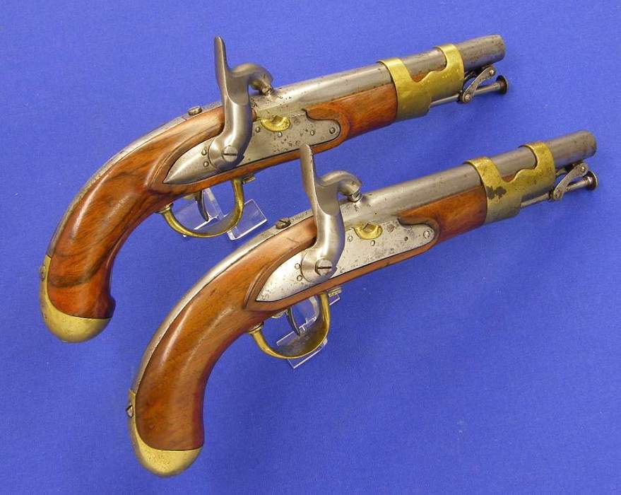 Bella pareja de pistolas de percusion francesas para oficial por Blanchard en calibre de 18 mm. y largo de 39 cm. En estado impecable.