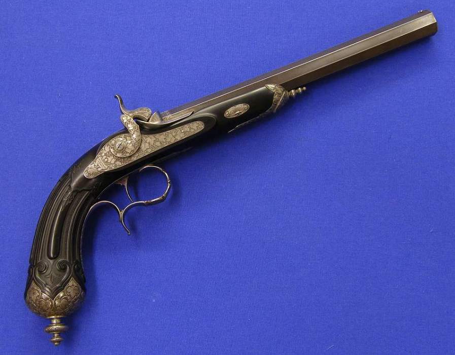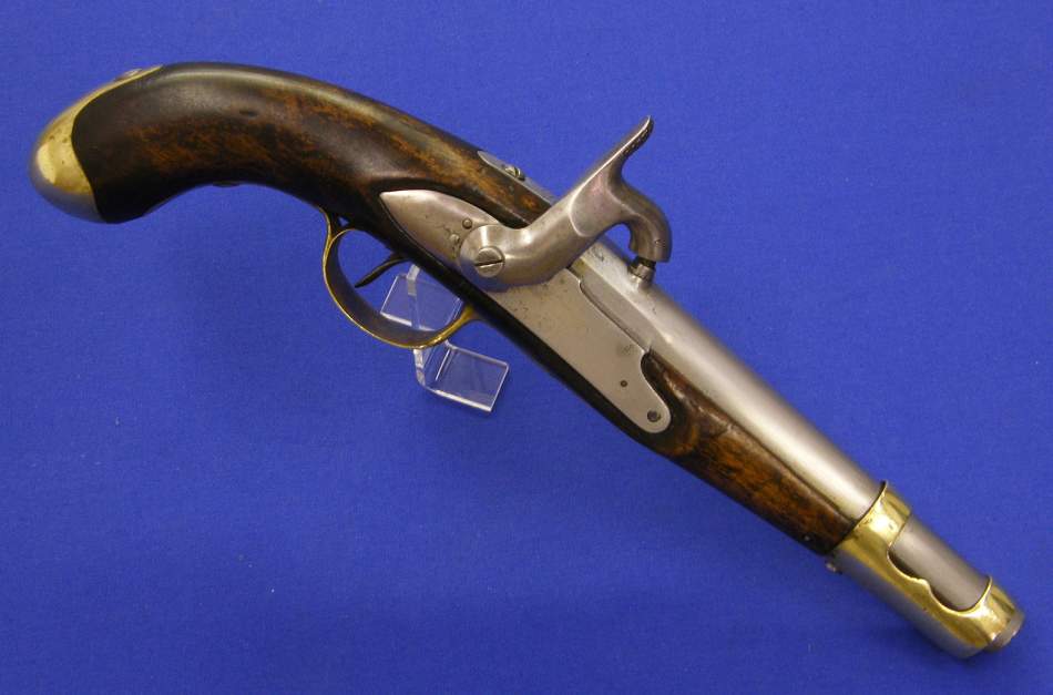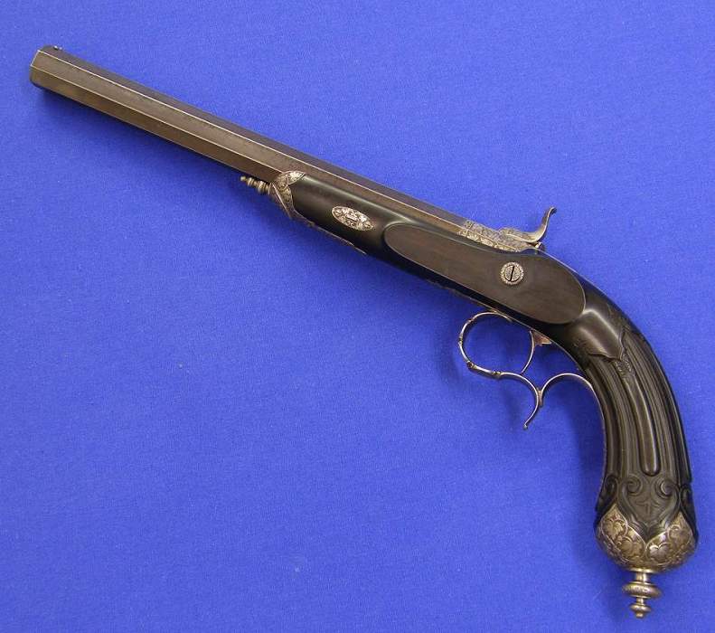 Una excelente pistola de percusion francesa fabricada po Gauvain de Paris, calibre de 12 mm. Y longitud d 41 cm. En perfecto estado.