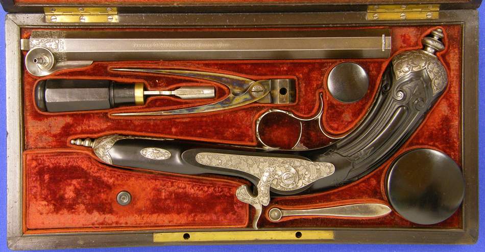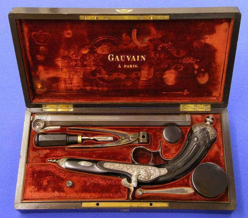 A superb cased percussion pistol by Gauvain a Paris, caliber 12mm, length of the pistol 41 cm, in mint condition