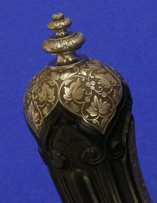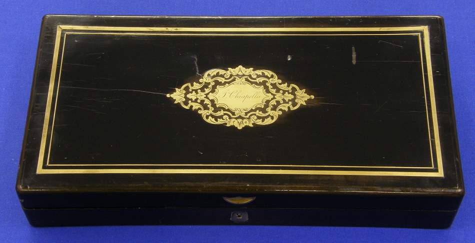 The stock of the pistol is very fine carved in ebony. All the iron parts are high quality chiselled. The barrel is signed Gauvain 93 Boulevard du Montparnasse a Paris. Lockplate signed Gauvain a Paris. The case is in ebony with fine inlay on the lid with the name J.Chiapella.