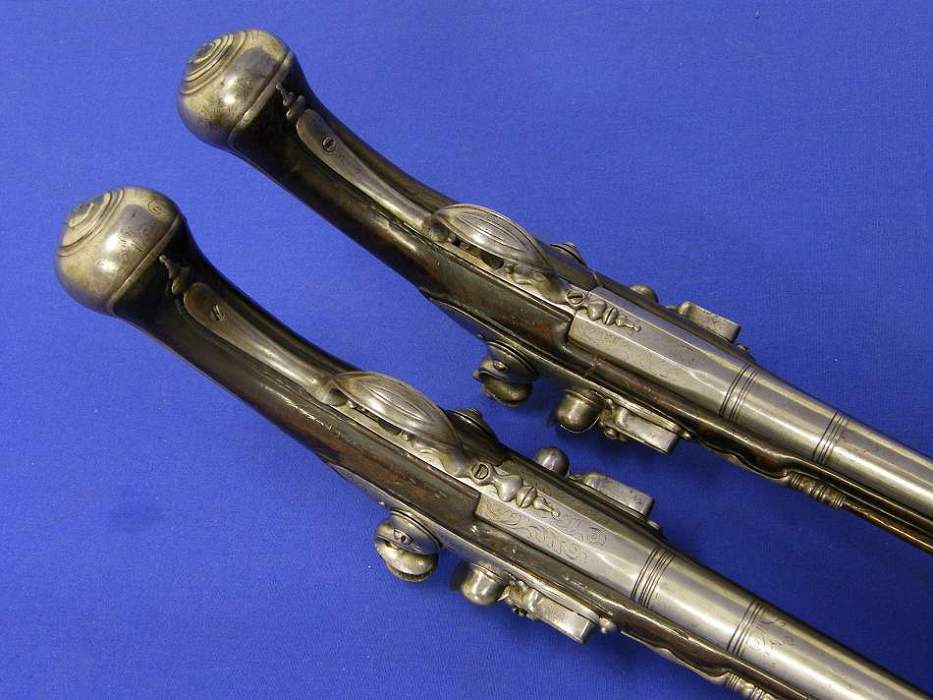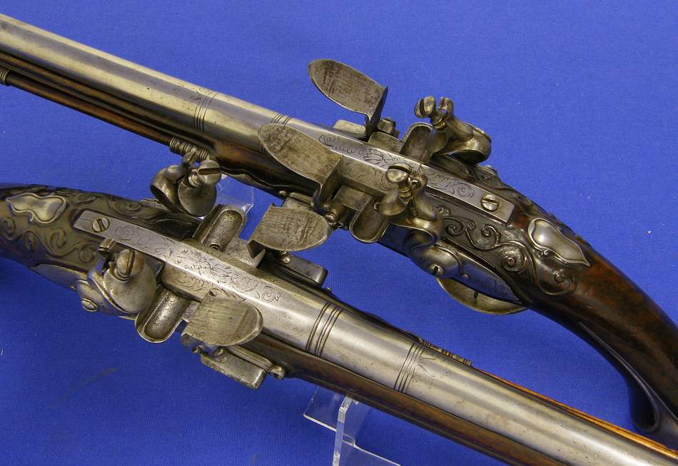 Menuda pareja de pistolas de chispa alemanas de doble cañon, bastante pesadas por Johann Bosselman (Elberfeld Westfalen Germany) cerca de 1690, (a los alemanes, por lo visto, les encantan las armas de multiples cañones desde siempre) longitud 51 cms (cada una) en muy buen estado.
